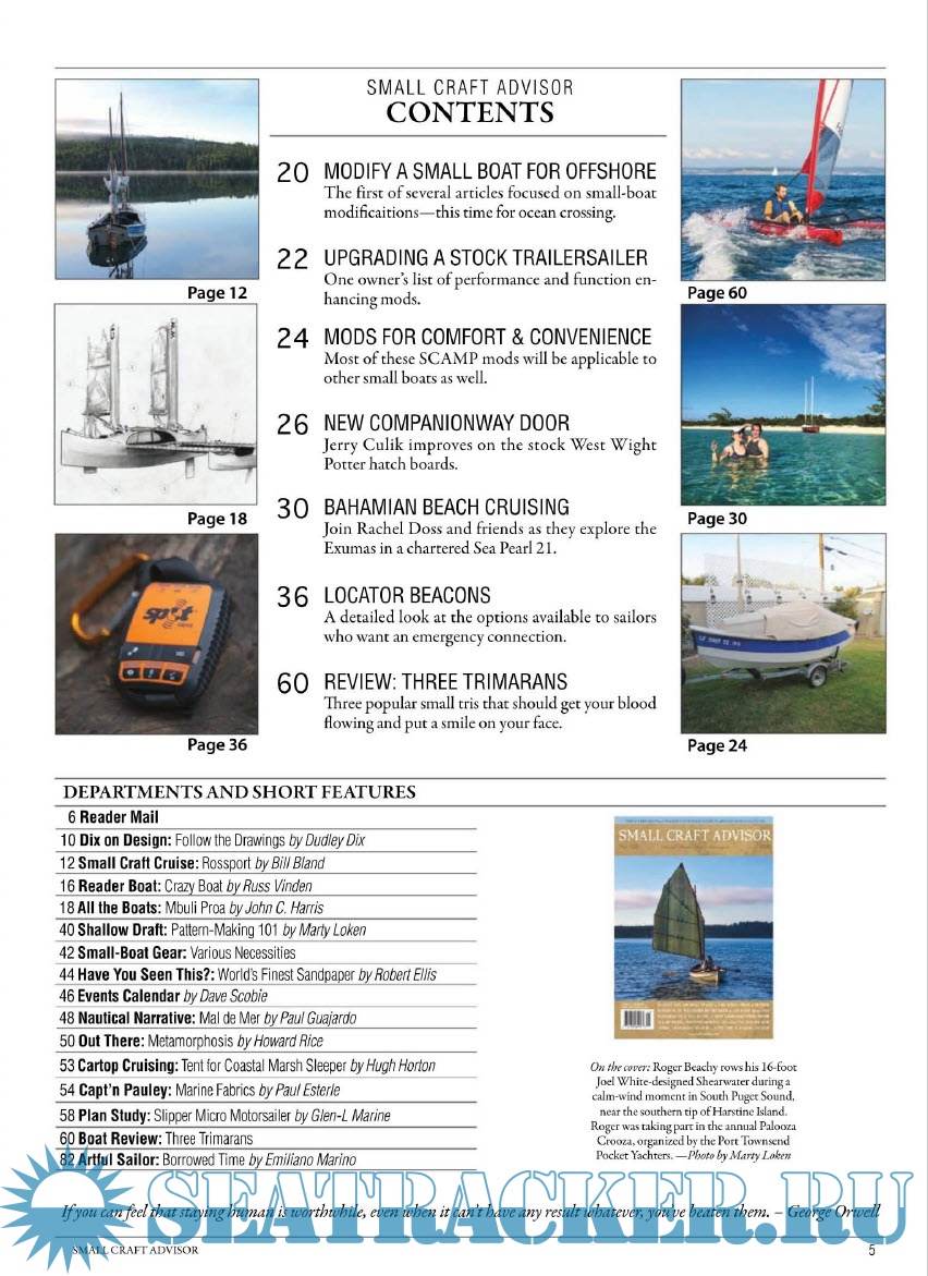 Year: 2020 Language: English Author: Larry Brown Editor-at-Large Genre: Periodical (magazine) Publisher: Joshua Colvin Edition: #123 - May, June Format: PDF Quality: eBook Pages count: 84 Description: Small boats, big adventure! The only magazine focused on small and trailerable sailboats, cruising, and adventure. Each issue features places to sail, how-to and modification articles, a plan study for the boat builder, and a feature-length review of a production sailboat.