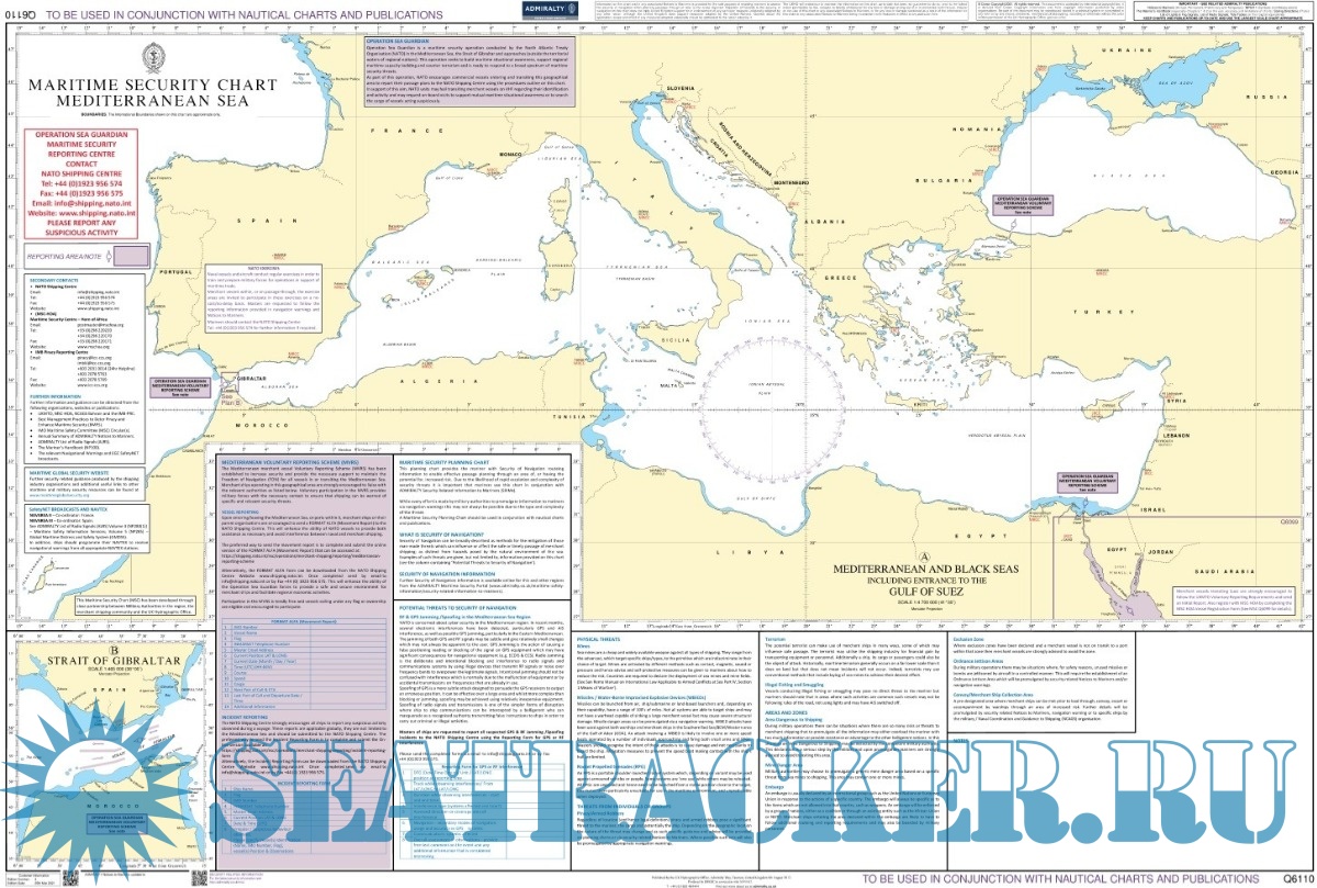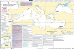 Chart Q6110 - Mediterranean Sea:This Maritime Security Chart contains security related information to mariners for the stated geographical area. It also includes the details of reporting schemes and regional contacts, as well as general security advice and is to be used in conjunction with standard nautical charts and publications.