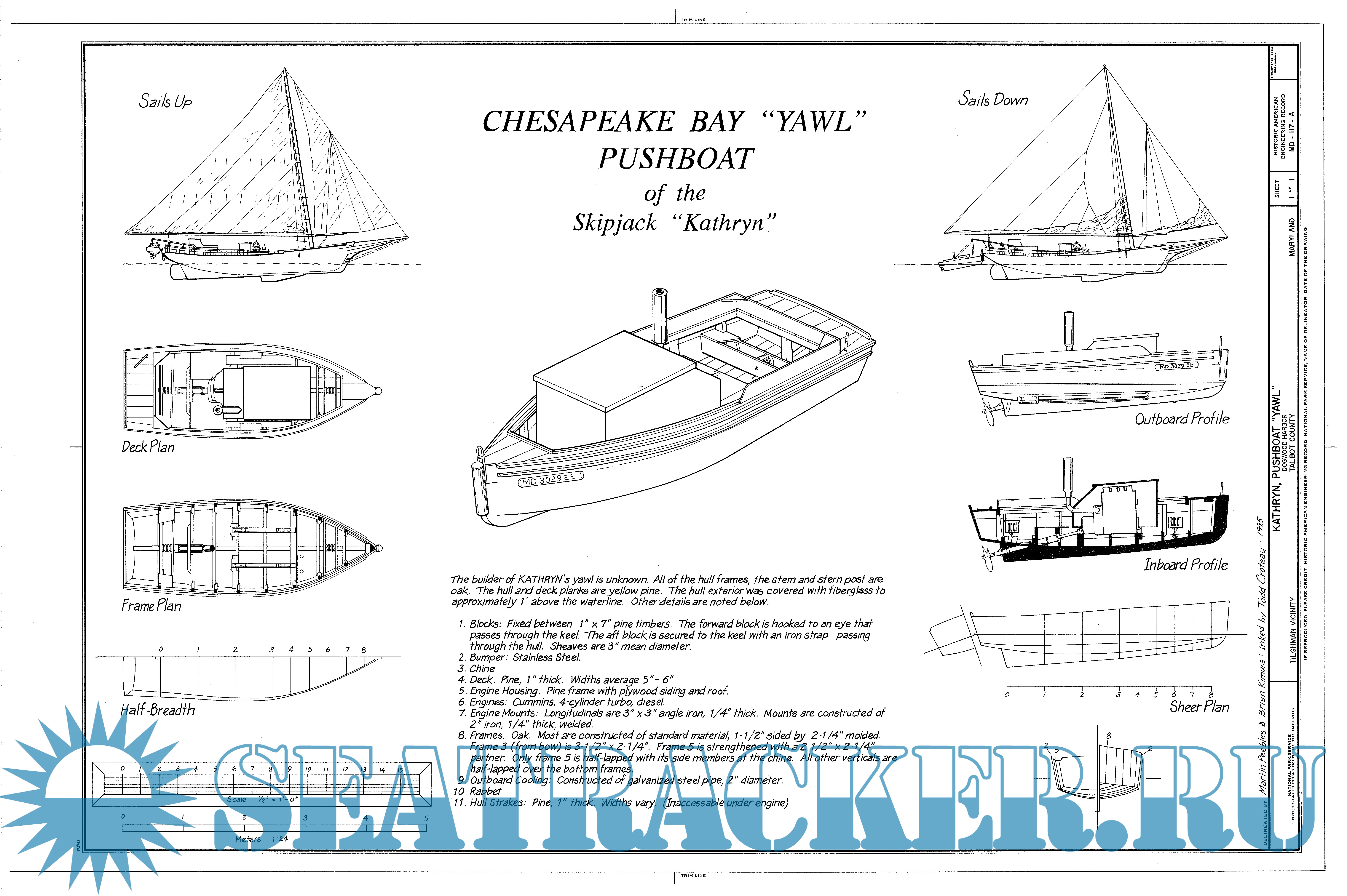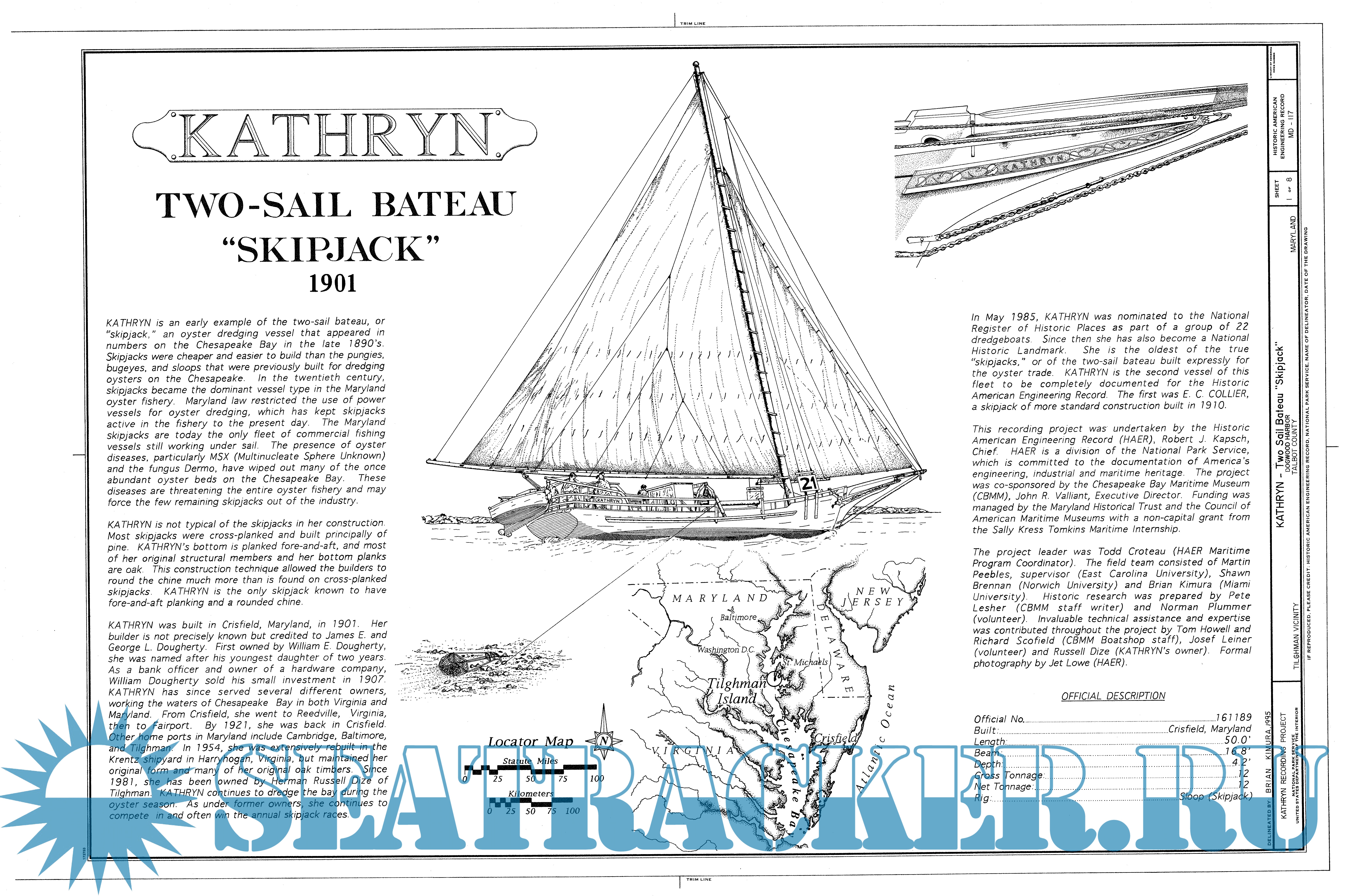 Year: 1995 Language: english Author: Martin Peebles, Brian Kimura Genre: Practical guide Format: JPEG Quality: Scanned pages Pages count: 9 Description: The builder of KATHRYN's yawl is unknown. All of the hull frames, the stem 2nd stern poet are oak- The hull 2nd deck planks are yellow pine. The hull exterior was covered with fiberglass to approximately 1' above the waterline. KATHRYN is an early example of the two-sail bateau, or "skipjack," an oyster dredging vessel that appeared in numbers on the Chesapeake Bay in the late 1890's. Skipjacks were cheaper and easier to build than the pungies, bugeyes, and sloops that were previously built for dredging oysters on the Chesapeake. In the twentieth century, skipjacks became the dominant vessel type in the Maryland oyster fishery. Maryland law restricted the use of power vessels for oyster dredging, which has kept skipjacks active in the fishery to the present day. The Maryland skipjacks are today the only fleet of commercial fishing vessels still working under sail. The presence of oyster diseases, particularly M5X (Multinucleate Sphere Unknown) and the fungus Dermo, have wiped out many of the once abundant oyster beds on the Chesapeake Bay. These diseases are threatening the entire oyster fishery and may force the few remaining skipjacks out of the industry.
