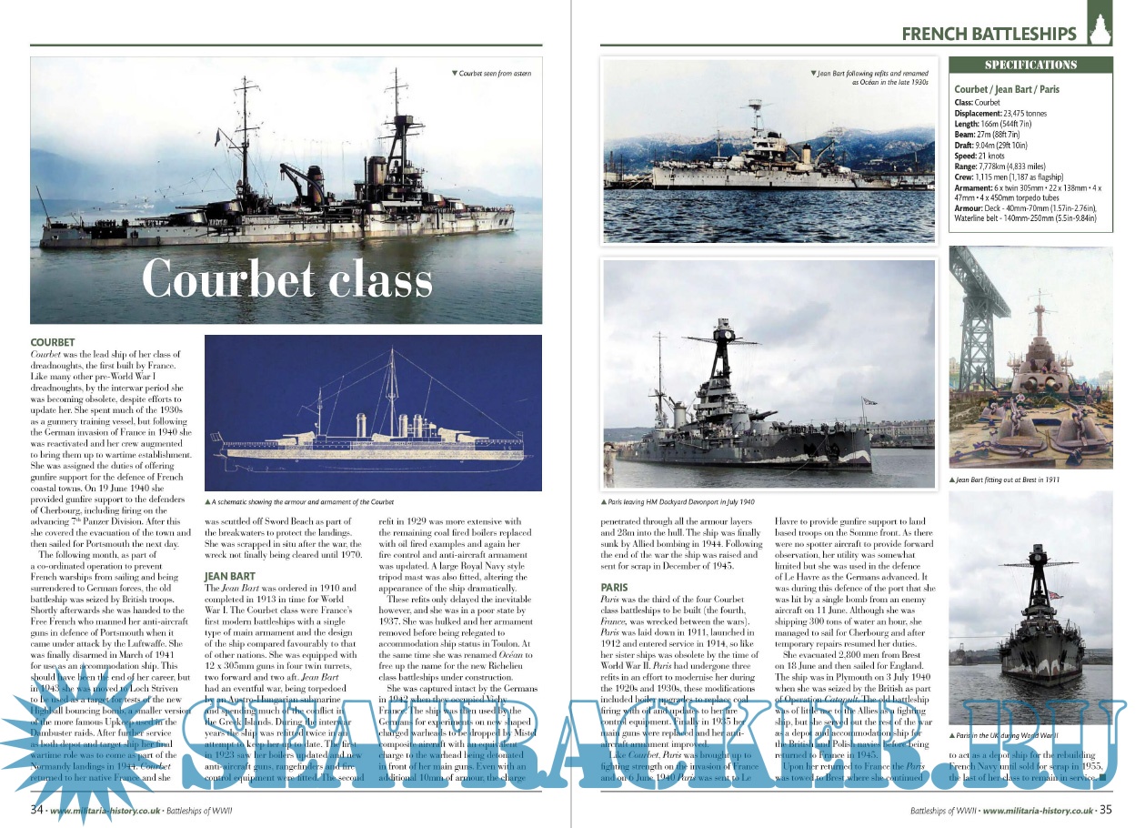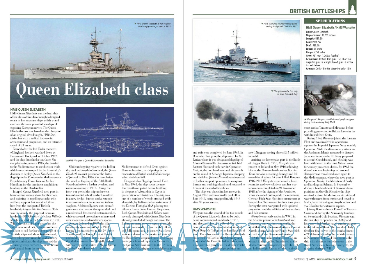 Here you will find 85 battleships and pocket battlesliips, with schematics for each class, a build history and their role in WWII. They are organised by country and then by class, such as the Queen Eliabeth class, where the ships had similar characteristics. There are specification panels for all classes and the sliips where they differed from each other.