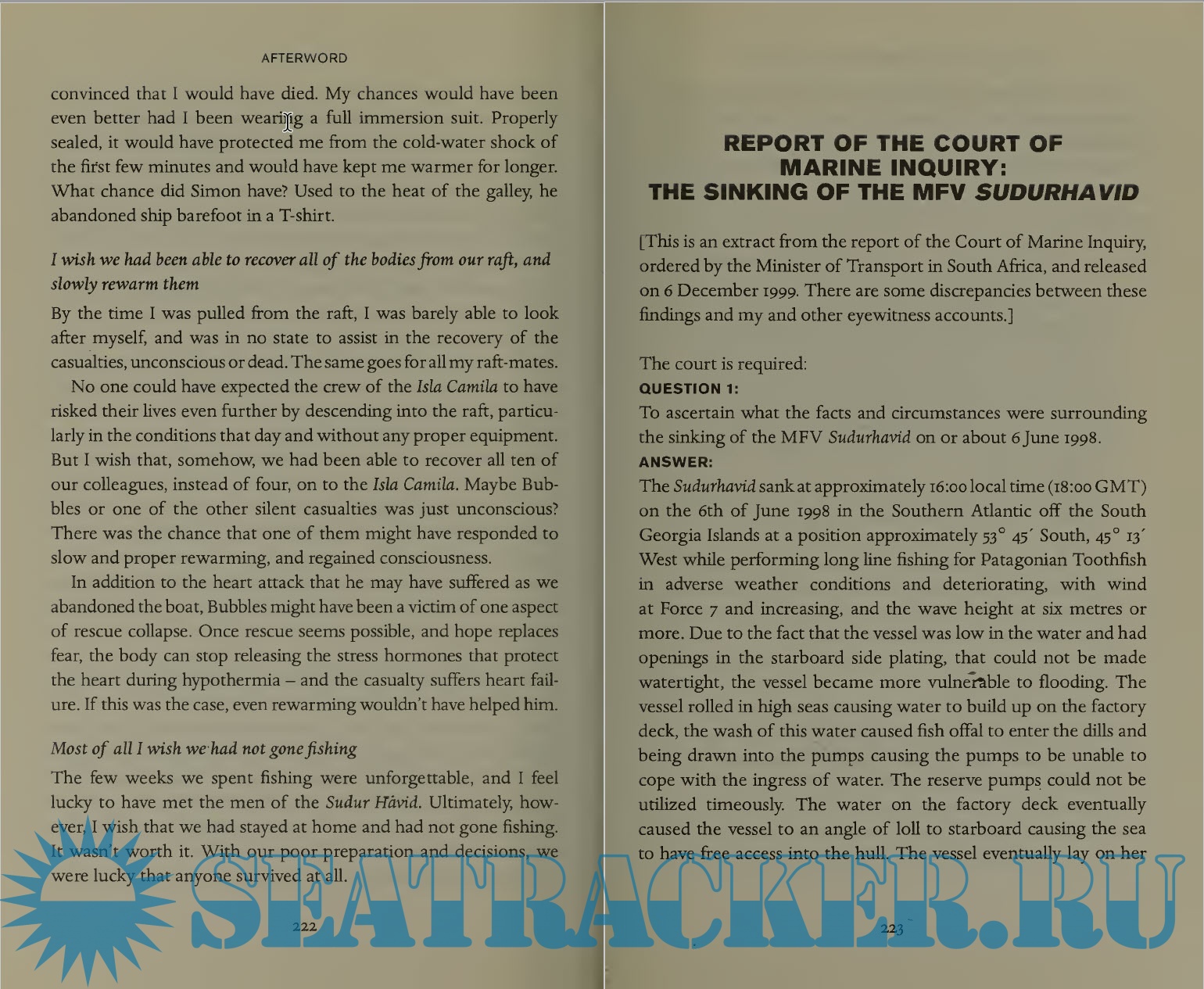 Description: In 1998, a young Scotsman named Matt Lewis sought to boost to his budding career as a marine biologist by securing a position as the "scientific observer" on a fishing vessel. Though he would be considered an officer, his role would be limited and relatively tame compared to the rest of the crews’: documenting wildlife the boat encountered, while also keeping notes on the crew’s adherence to fishing regulations. A coin flip landed him aboard the Sudur Havid, a South African boat bound for the outer waters of Antarctica’s frigid and tempestuous Southern Ocean. Even though his novice eyes, Lewis was immediately struck by its apparent unreadiness, including a dearth of adequate boots and survival suits, and a crew seemingly unprepared for work in the harsh polar environment.