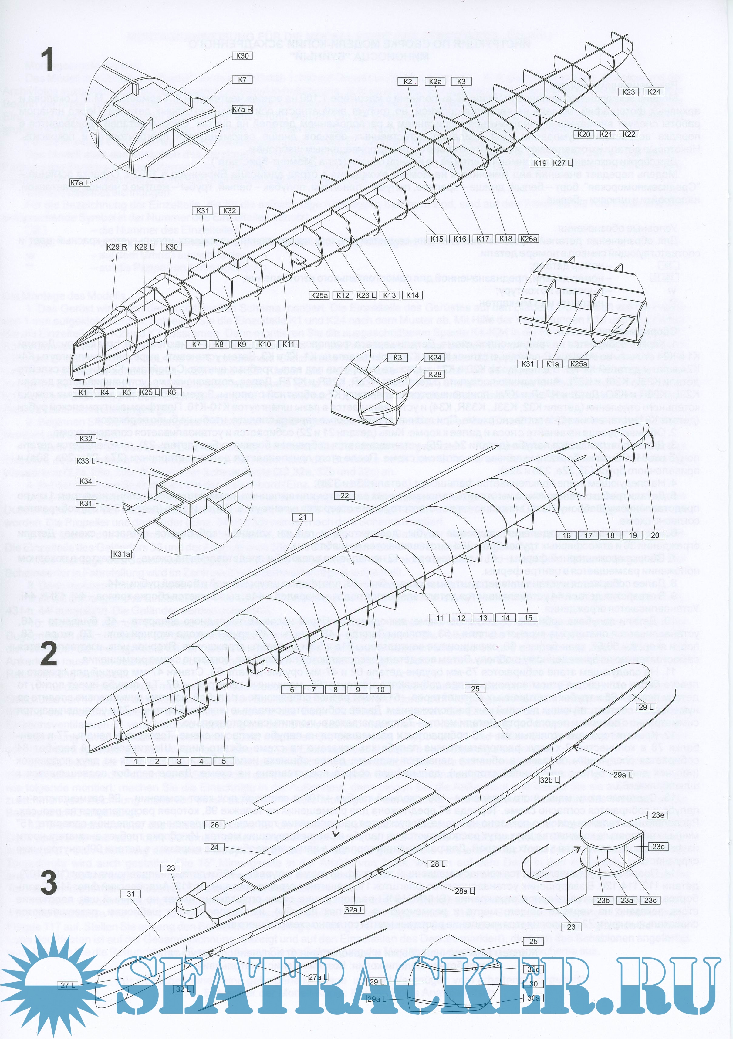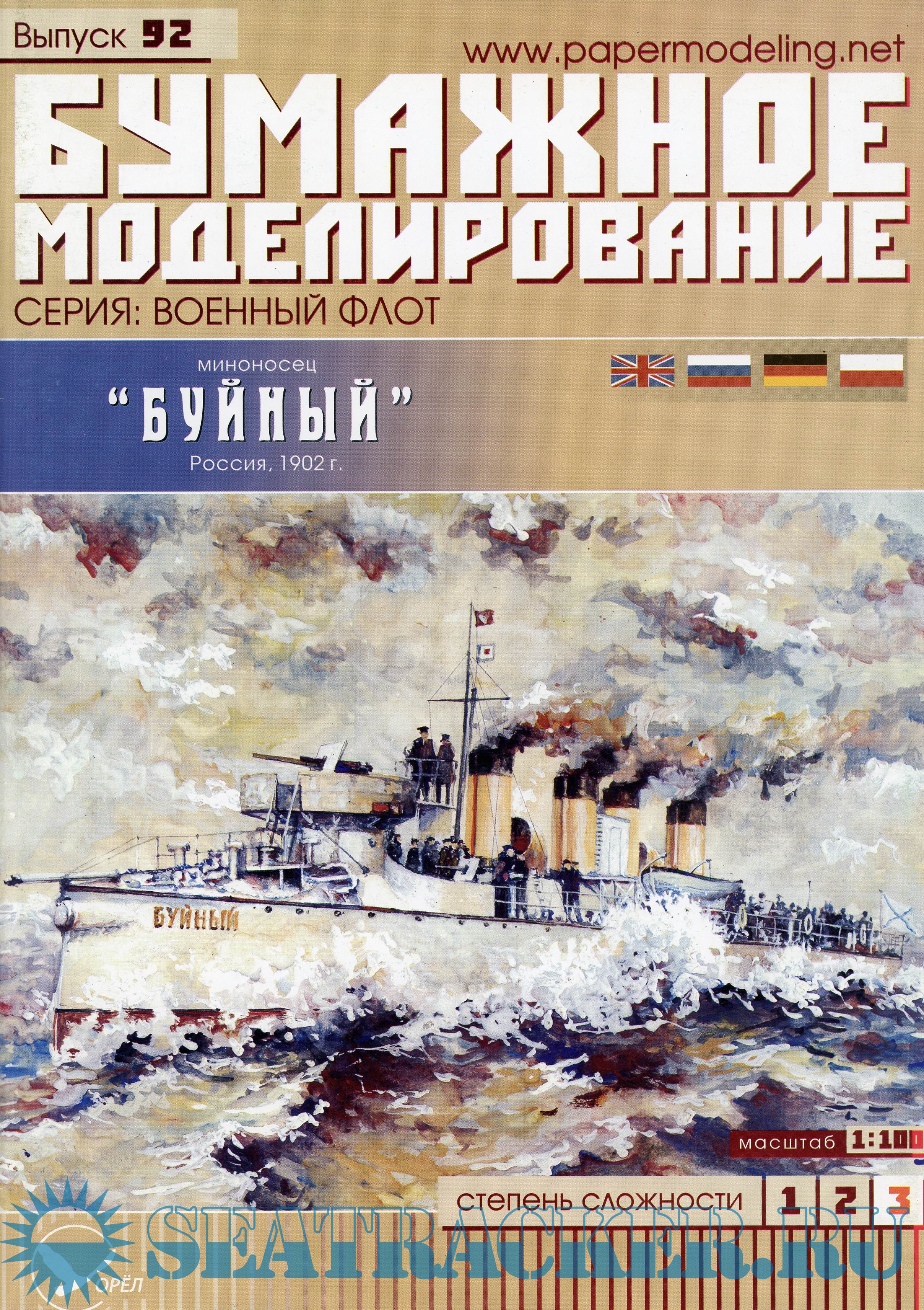 13 листов формата А4 цветных выкроек для создания модели миноносца "Буйный" по состоянию на 1902 год в масштабе 1:100. Инструкция на русском, немецком и польском языках.