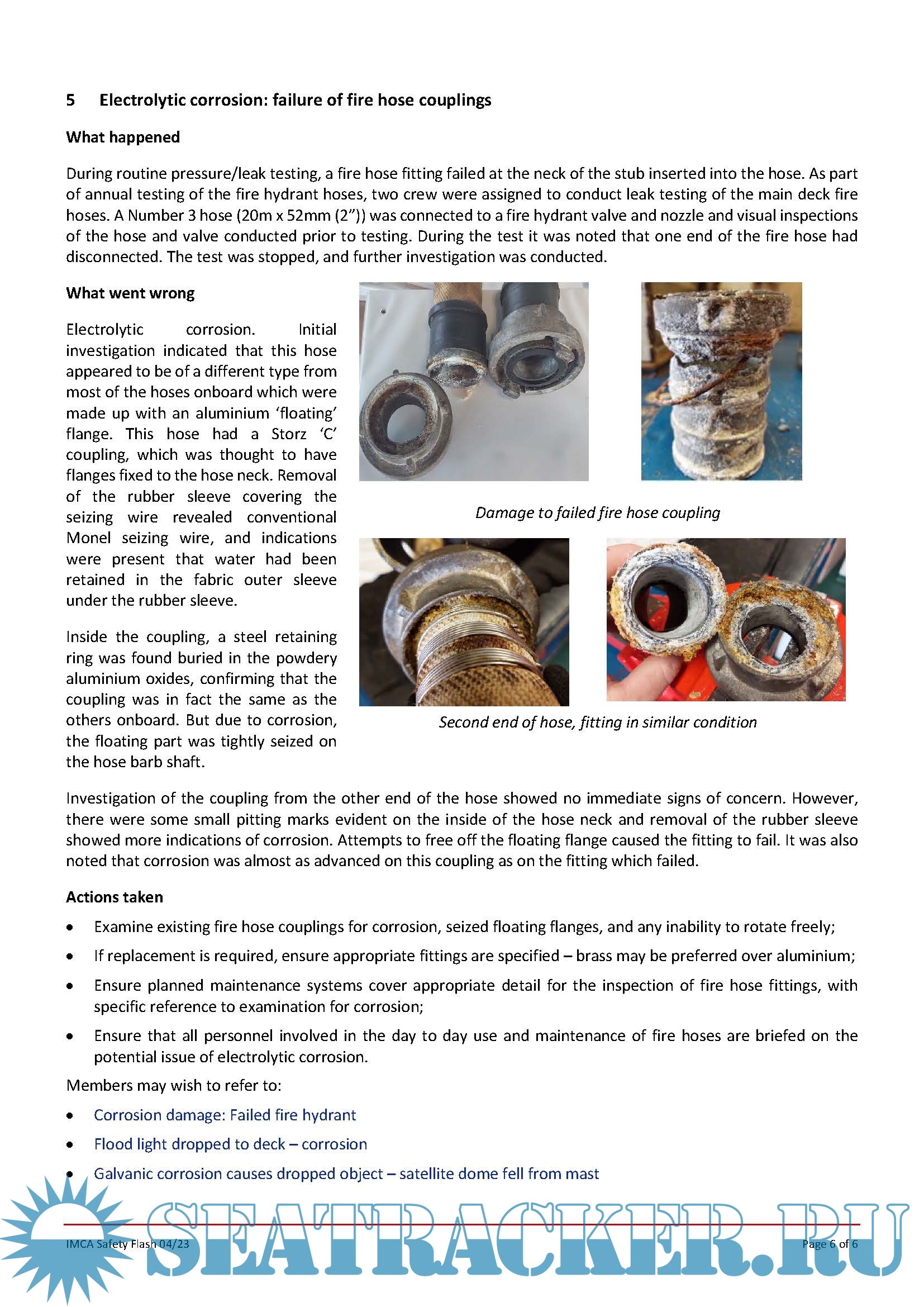 IMCA SF 04/23 • High potential near miss: Uncontrollable movement of auxiliary whip line • Uncertified lifting gear found in use • Dropped objects in dry dock • Air hose connection failure • Electrolytic corrosion: failure of fire hose couplings