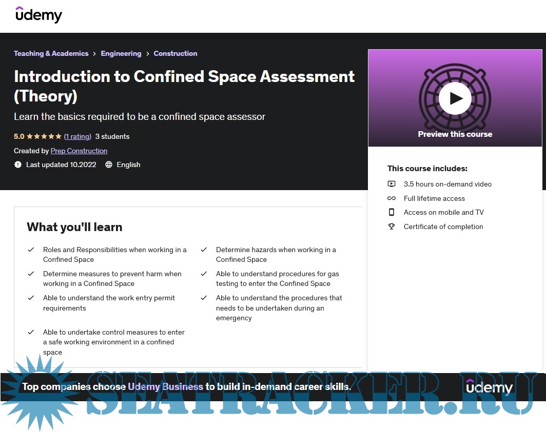 Year: 2022 Language: english Genre: Udemy eLearning Video Playtime: 13 sections • 87 lectures • 3h 26m total length Quality: WEBRip Format: MP4 Video: h264, 1280x720 Audio: AAC, 44.1 KHz Description: Welcome to the Introduction to Confined Space Assessment (Theory) course, the only course you need to learn all the basics required to be a confined space assessor. The course is taught by our instructor John who has more then 10 years working in the construction industry. This course is taught using the method similar to Khan Academy which allows students to grasp the lessons taught easily. There will be quizzes as well to test students on their understanding on a specific topic. This video lectures are in bite-size lessons to allow students to concentrate and retain the knowledge better. The course will be constantly updated if there is any new content or breakthrough in the industry. The curriculum was developed over many months in order to provide the best way to deliver a well though course. Who this course is for: If u want to know more about the job scope and task of a confined space assessor If you aspire to be a confined space assessor in the future If you just want to learn more about the various roles in the construction industry If you job scope involves working in a confined space What you'll learn: Roles and Responsibilities when working in a Confined Space Determine hazards when working in a Confined Space Determine measures to prevent harm when working in a Confined Space Able to understand procedures for gas testing to enter the Confined Space Able to understand the work entry permit requirements Able to understand the procedures that needs to be undertaken during an emergency Able to undertake control measures to enter a safe working environment in a confined space :