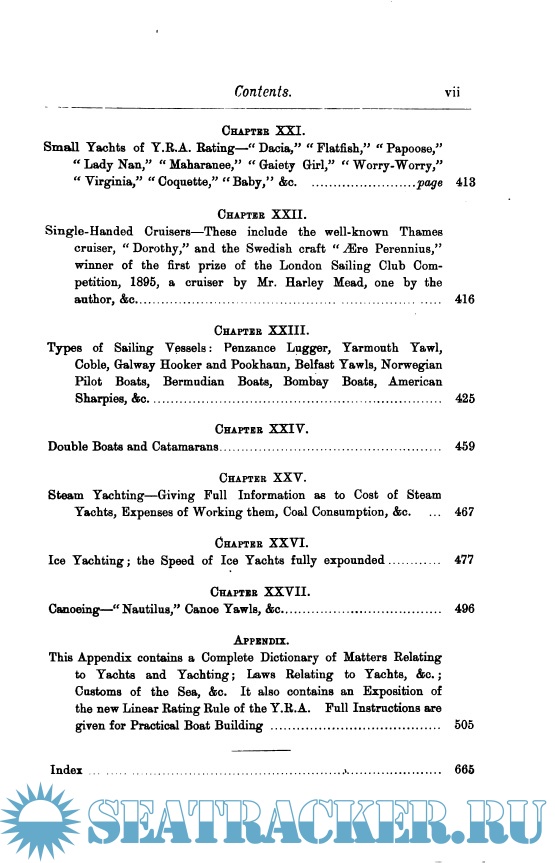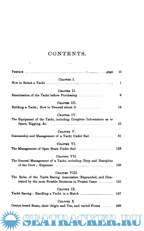 Year: 1900 Language: english Author: Dixon Kemp Genre: Practical guide Format: PDF Quality: Scanned pages Pages count: 685 Description: The first edition of "Yacht and Boat Sailing" was published in 1878, and, whilst the general plan of that edition has been maintained in snGcesaive issues, the matter relating to yachts and sailing boats has from time to time been considerably altered or exchanged for new subjects. The instruction as to rigging a yacht, seamanship, and the general handling of vessels under sail remains much the same as originally written, but where necessary each subject has been revised and made to accord with present practice. The chapters dealing with yacht racing have also been revised, and in many instances re-written; in short, the whole work has been brought up to date and made thoroughly representative of contemporary yachting in all its branches. In selecting a yacht, a man, as in making other purchases, will be guided by his tastes and his means. If he is really fond of the art of fore and aft sailing, and looks forward to a life on the sea with the professional keenness of a middy or apprentice, his desire will be to obtain a yacht which he can direct the handling of himself. If, on the other hand, the dawning yachtsman has boundless wealth, is a little of a sybarite, and determines to spend two or three months afloat because it is the fashion, he, too, will get a yacht to his taste; but she will probably be a large steamer, unless he has determined on racing, when a large cutter, yawl, or perhaps a schooner would be chosen.