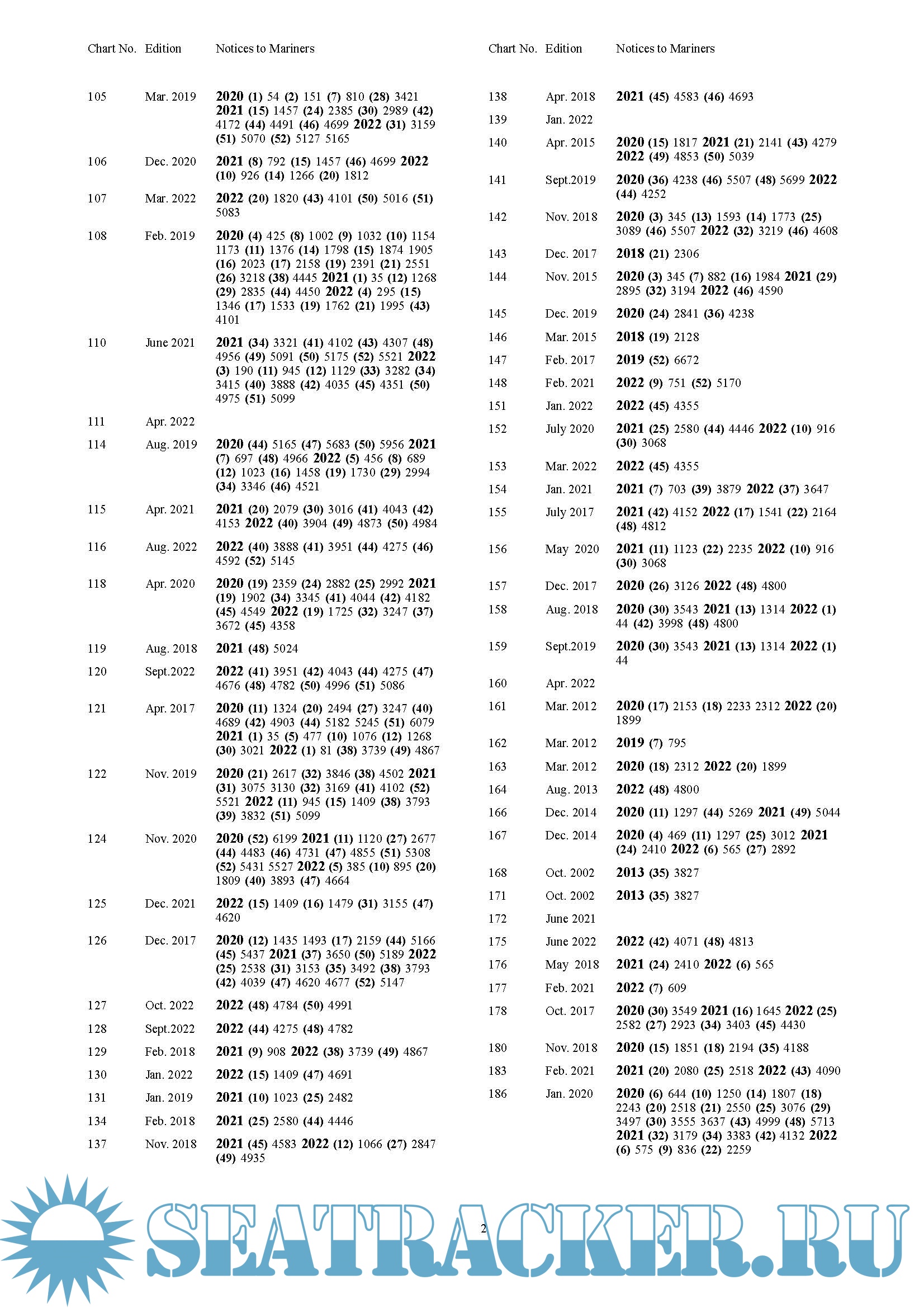 Description: The Cumulative List of ADMIRALTY Notices to Mariners (NP234 A/B) can help you to identify outstanding NMs and audit trails for a particular chart or charts. The list is published annually, with Part A in January and Part B in July.