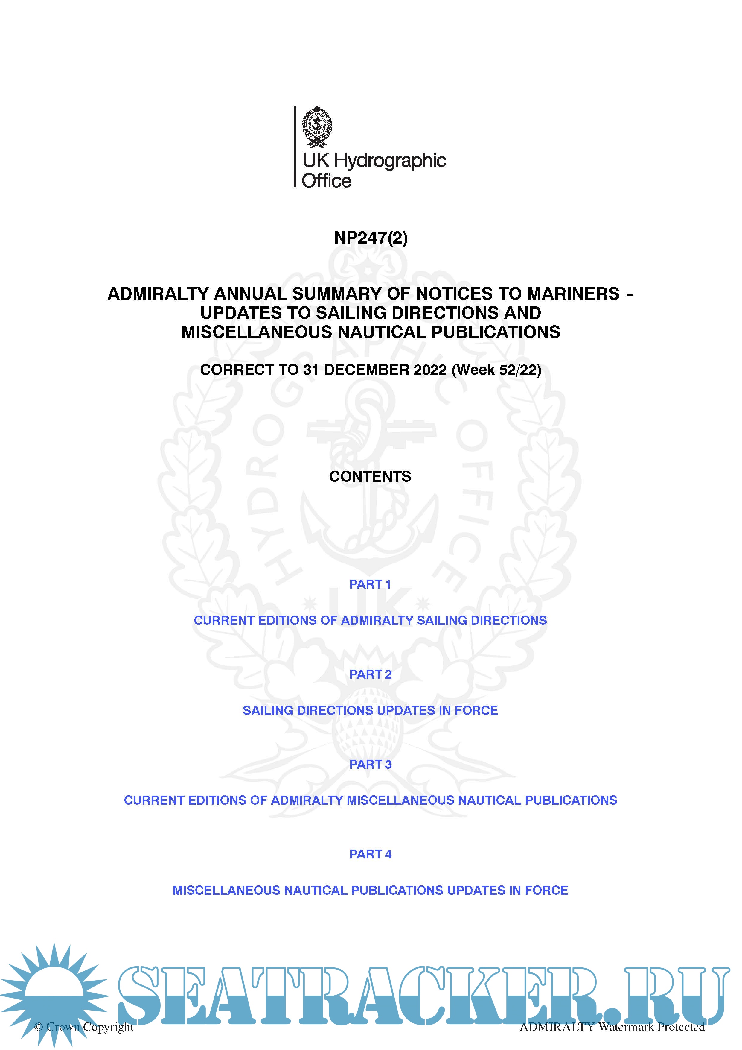Year: 2023 Language: english Author: UKHO Genre: Documentation Edition: 31 December 2022 Format: PDF Quality: eBook Pages count: Multiple Description: Annual Summary of ADMIRALTY Notices to Mariners 2023 (NP247) To supplement Weekly NMs, the UKHO produces an Annual Summary of Notices to Mariners (NP247). This publication contains the Annual Statutory Notices to Mariners Numbers 1-26, a summary of Temporary and Preliminary Notices to Mariners still in force at the start of the year, and a Cumulative Summary of Amendments to ADMIRALTY Sailing Directions. The paper version of the Annual Summary of Notices to Mariners is published annually in January. Correct to 31 December 2022 (Week 52/21)