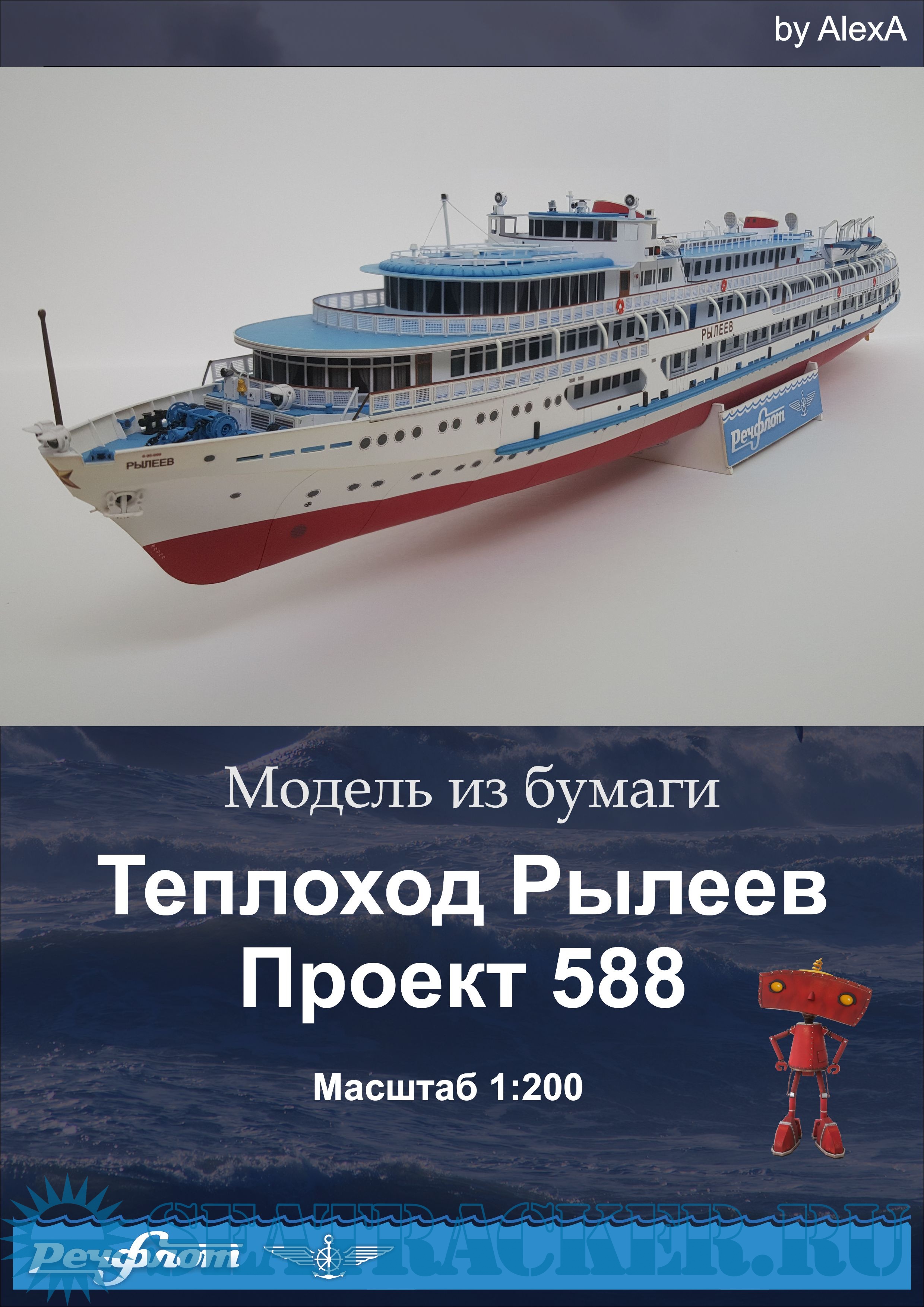20 листов цветных выкроек и инструкций для сборки бумажной модели теплохода Рылеев. (Проект 588) в масштабе 1:200