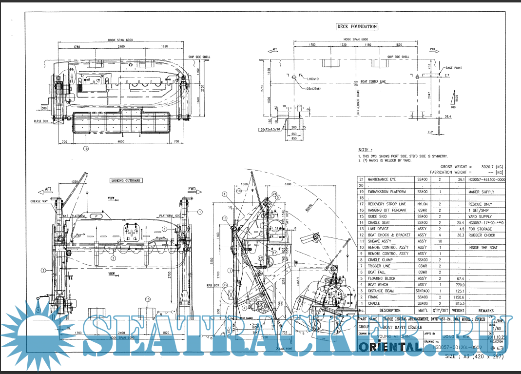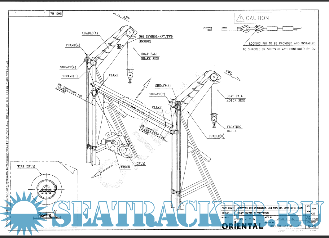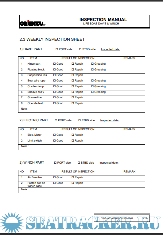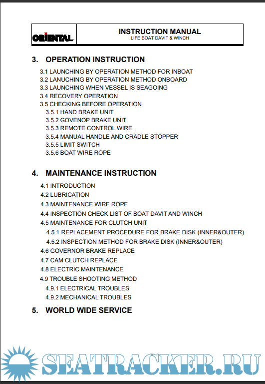 Description: This instruction manual is prepared in accordance with the MSC/Circ.1206 Guidelines for periodic Servicing and Maintenance of boat davit & winch. Annual check, servicing and repair should be performed by the ship’s crew in the presence of the manufacture’s repair tentative or a person appropriately trained and certified of the manufacturer for the work to be done. Please refer to the instruction and maintenance manual for boat davit & winch manufactured after the Reg. of SOLAS.