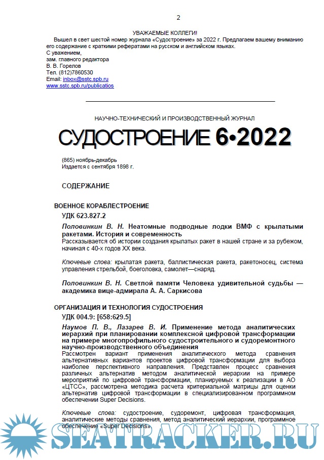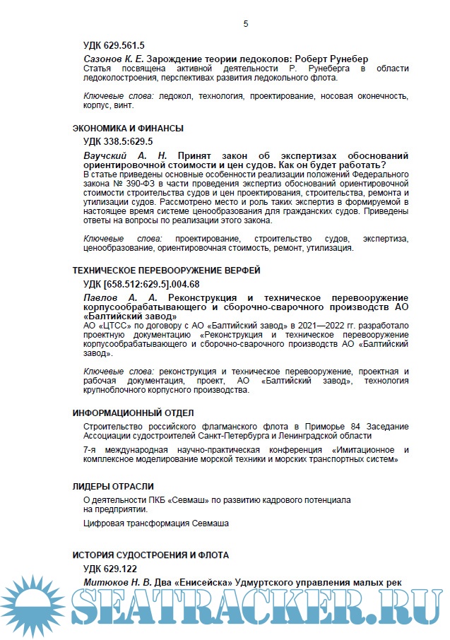 Описание: В журнале публикуются статьи ученых и специалистов на темы, связанные с проектированием, постройкой, ремонтом, модернизацией и утилизацией военных кораблей, гражданских судов. Регулярно выходят в свет работы, посвященные организации и технологии судостроительного производства, проектированию верфей и доков, новым судостроительным материалам. Большое внимание уделяется вопросам судовой энергетики и новым разработкам в области морской техники.