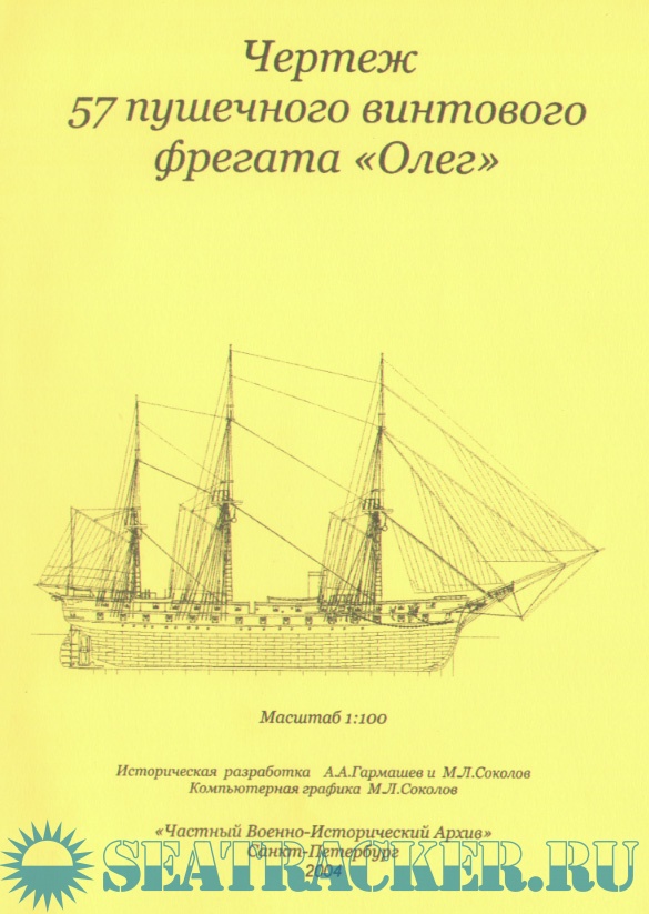 Год выпуска: 2004 Язык: русский Автор: Гармашев А.А. и Соколов М.Л. Жанр: Другое Формат: JPEG Качество: Отсканированные страницы Количество страниц: 18 Описание: Автором проекта и строителем фрегата был корабельный инженер полковник А. Х. Шаунбург. Корпус фрегата был построен в Кронштадте, в северном Петровском доке из металлов, лиственницы, а также частично дуба и сосны почётным гражданином Кудрявцевым и его мастеровыми[1]. Крепление подводной части медное, а надводной железное. Толщина наружной обшивки составляла 6 дюймов (152 мм). У ватерлинии и выше её обшивка утолщалась до 9 дюймов (229 мм). Заложен 29 января 1858 года, спущен на воду 4 июня 1860 года[1]. Во многом однотипен фрегату «Александр Невский». При выводе из дока оказалась, что фрегат не может пройти в ворота, и в день его спуска ворота дока было приказано расширить Механизм фрегата был изготовлен в Англии на заводе «Модзлей и Фильд[en]». Шесть паровых котлов с угольным отоплением давали пар для двухцилиндровой горизонтальной паровой машины. Двухлопастный гребной винт диаметром 5,8 м был расположен в вертикальной раме, скользящей по пазам в вырезе кормы. При движении под парусами винт, отсоединенный от гребного вала, втягивался в колодец, устроенный в кормовом подзоре. Подъём осуществлялся тросом, проведенным на шпиль через канифас-блок, укрепленный на палубе. В ходе постройки в проект вносились некоторые изменения. Так, «согласно воле Его Императорского Высочества Генерал-адмирала» Великого князя Константина Николаевича были убраны громоздкие гальюнные решетки и тяжеловесный княвдигед, сделан небольшой полубак, корма получила простую скругленную форму вместо традиционного транца с уширениями по бокам. Архитектура корпуса стала более современной по сравнению с ранее построенными фрегатами этой серии. Артиллерийское вооружение «Олега» было размещено в двух батареях: открытой — на верхней палубе (опер-дек) — 27 пушек и закрытой (гон-дек) − 30 пушек. В носовой части верхней палубы стояла 60-фунтовая длинная пушка (калибром в 196 мм) на поворотной платформе. При помощи талей платформа вместе с орудием могла перемещаться к орудийному порту правого или левого борта, разворачиваясь на роликах по медным дугообразным погонам на палубе. Ещё восемь 60-фунтовых «коротких» пушек стояли на верхней палубе у орудийных портов между грот- и бизань-мачтами. Как и все остальные орудия фрегата, они имели обычные колесные деревянные станки. Ещё 18 более легких 30-фунтовых пушек стояли у своих портов на верхней палубе. Нижняя батарея имела двадцать шесть 60-фунтовых и четыре 30-фунтовых пушек. Для своего времени это было сильное вооружение. 60 фунтовая пушка могла бросать бомбы весом 17,7 кг на дистанцию до 1,6 морских миль (почти 3 км).