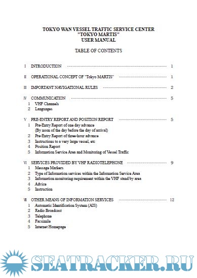 Year: 2011 Language: english Author: Japan Coast Guard Genre: Manual Publisher: JCG Format: PDF Quality: eBook Pages count: 32 Description: Tokyo-Wan Vessel Traffic Service Center, "Tokyo MARTIS", whose mission is to maintain and improve safety and efficiency of vessel traffic in the Tokyo Bay, has been established and operated by Japan Coast Guard. This User manual aims at contributing to safe navigation of vessels by explaining about services provided by "Tokyo MARTIS" and essential information while navigating in the Tokyo Bay. A vessel navigating in the Tokyo Bay is highly recommended to carry this manual in the bridge and utilize as a reference book.
