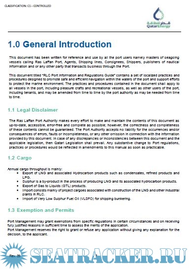 Description: This document has been written for reference and use by all the port users namely masters of seagoing vessels calling Ras Laffan Port, Agents, Shipping lines, Consignees, Shippers, publishers of nautical information and or any other party that transacts business through the Port.
