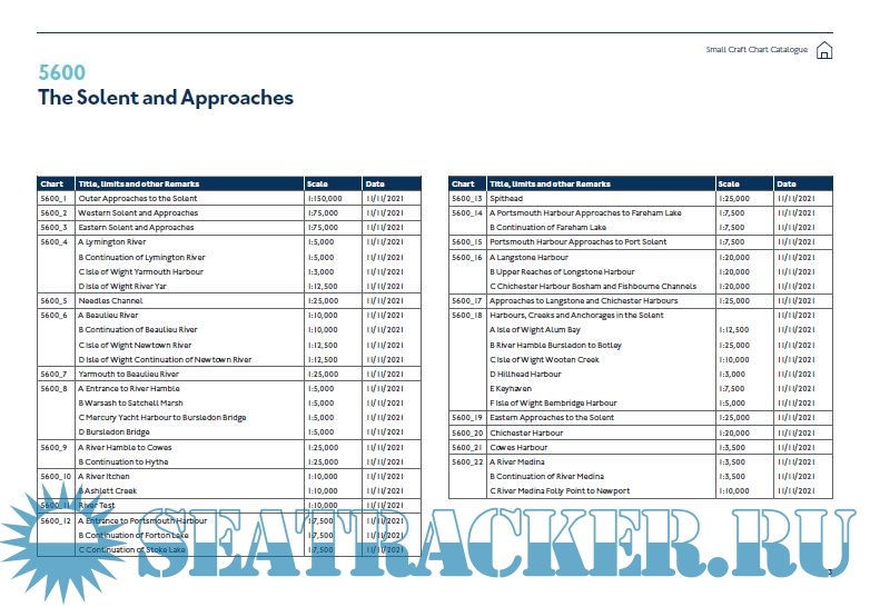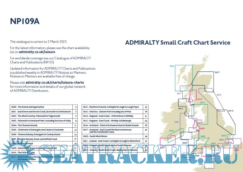 Year: 2021 Language: english Author: UKHO Genre: Catalogue Publisher: United Kingdom Hydrographic Office (UKHO) Edition: 1st Format: PDF Quality: eBook Pages count: 48 Description: ADMIRALTY Small Craft Chart Service has A2 charts for UK coastal navigation. Quality assured by maritime experts at the UK Hydrographic Office (UKHO), charts in the Small Craft Chart Service contain appropriate chart coverage and scales to help leisure yachtsmen, motor boat cruisers, ocean racing skippers and other leisure mariners maintain safety of life at sea. Additional info: Catalogue updated 02 March 2023.