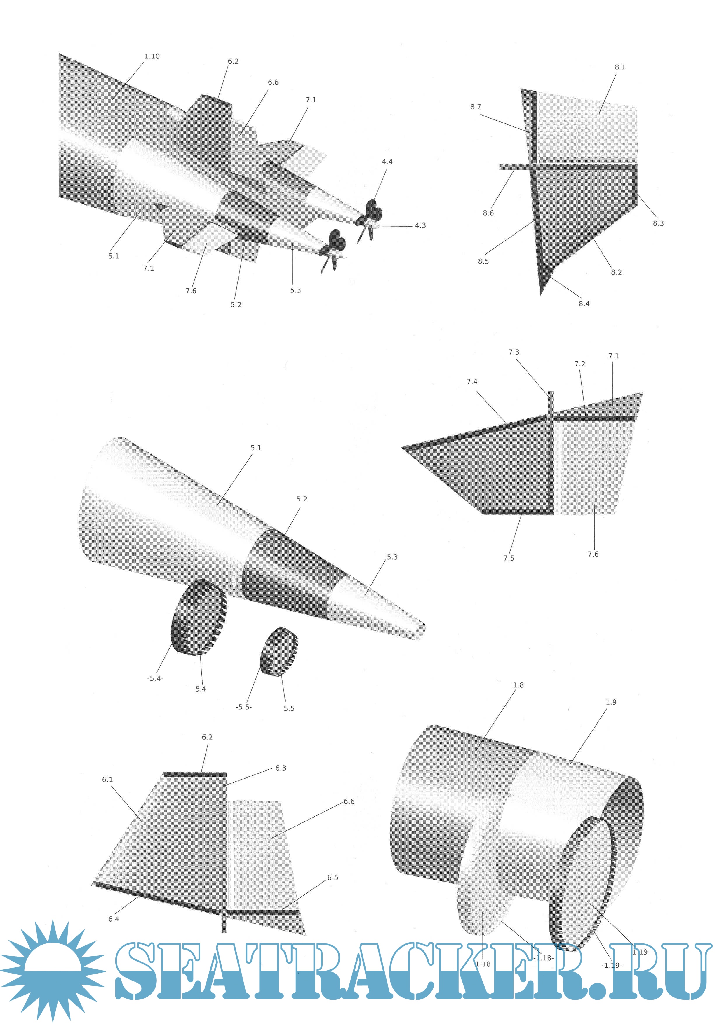 9 листов цветных выкроек и инструкций для изготовления бумажной модели атомной подводной лодки К-222 проект 661 "Анчар" в масштабе 1:200