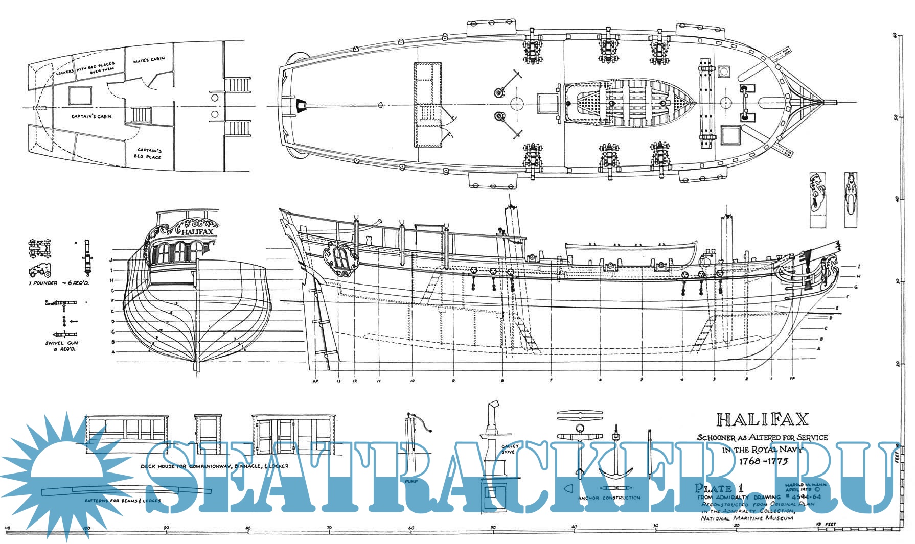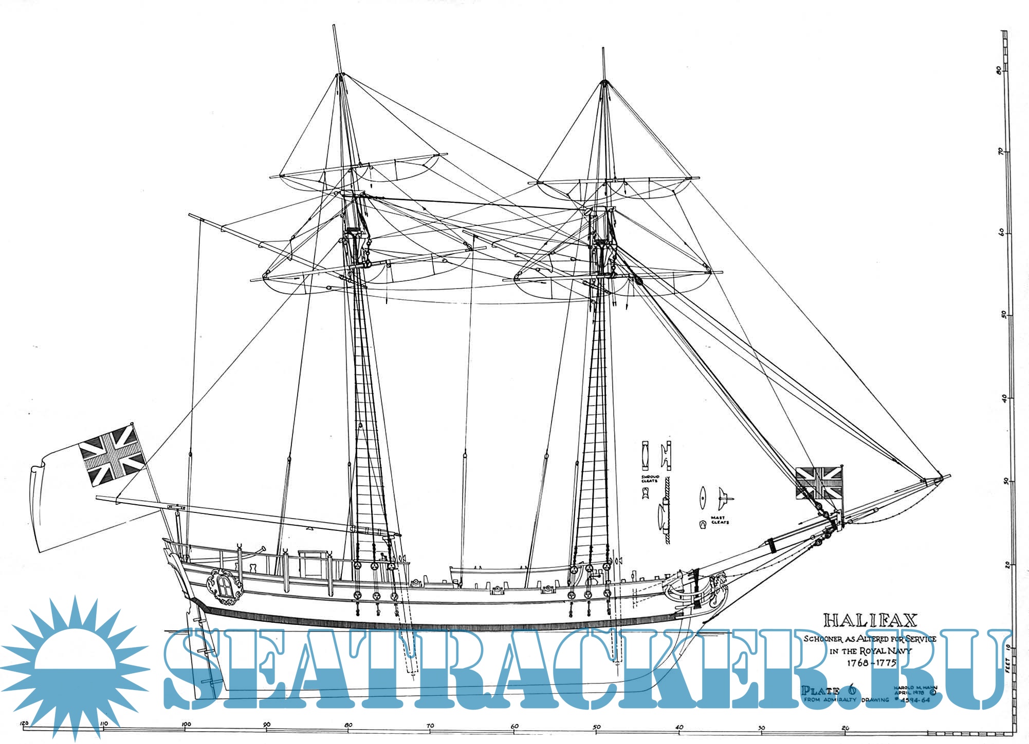 6 листов чертежей английского парусника HMS Halifax 1768-1779 года