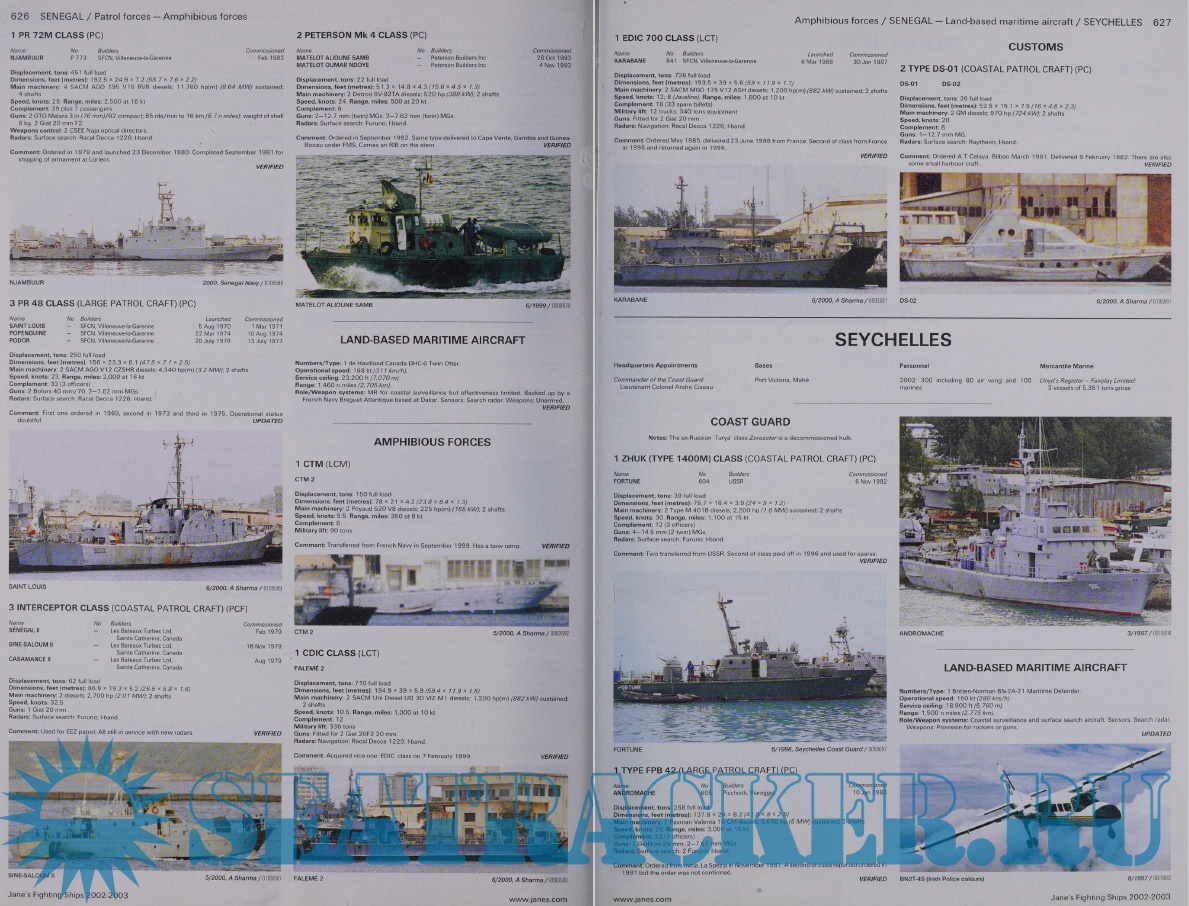 Year: 2002 Language: english Author: S.A.Sanders Genre: Catalogue Format: PDF Quality: Scanned pages Pages count: 1016 Description: "Jane's Fighting Ships" is your essential reference to the changing capabilities of modern navies and coast guards, their ships and maritime aircraft in service and under construction. There are authoritative inventories for 164 navies around the world complete with comprehensive details of: displacement and dimensions, main machinery, speed and range, weapons systems and sensors, construction and modernization programs, latest operational status and strength of fleet including sales to other navies. In addition, there is an annual executive overview of naval highlights worldwide, flags and ensigns, ranks and insignia, senior appointments and personnel numbers. It is intended for: armed forces, defense ministries, maritime SAR organizations, naval training establishments, coastguards, marine police, naval weapons manufacturers, shipbuilders, port authorities, maritime and safety agencies, defense analysts and academics, media.