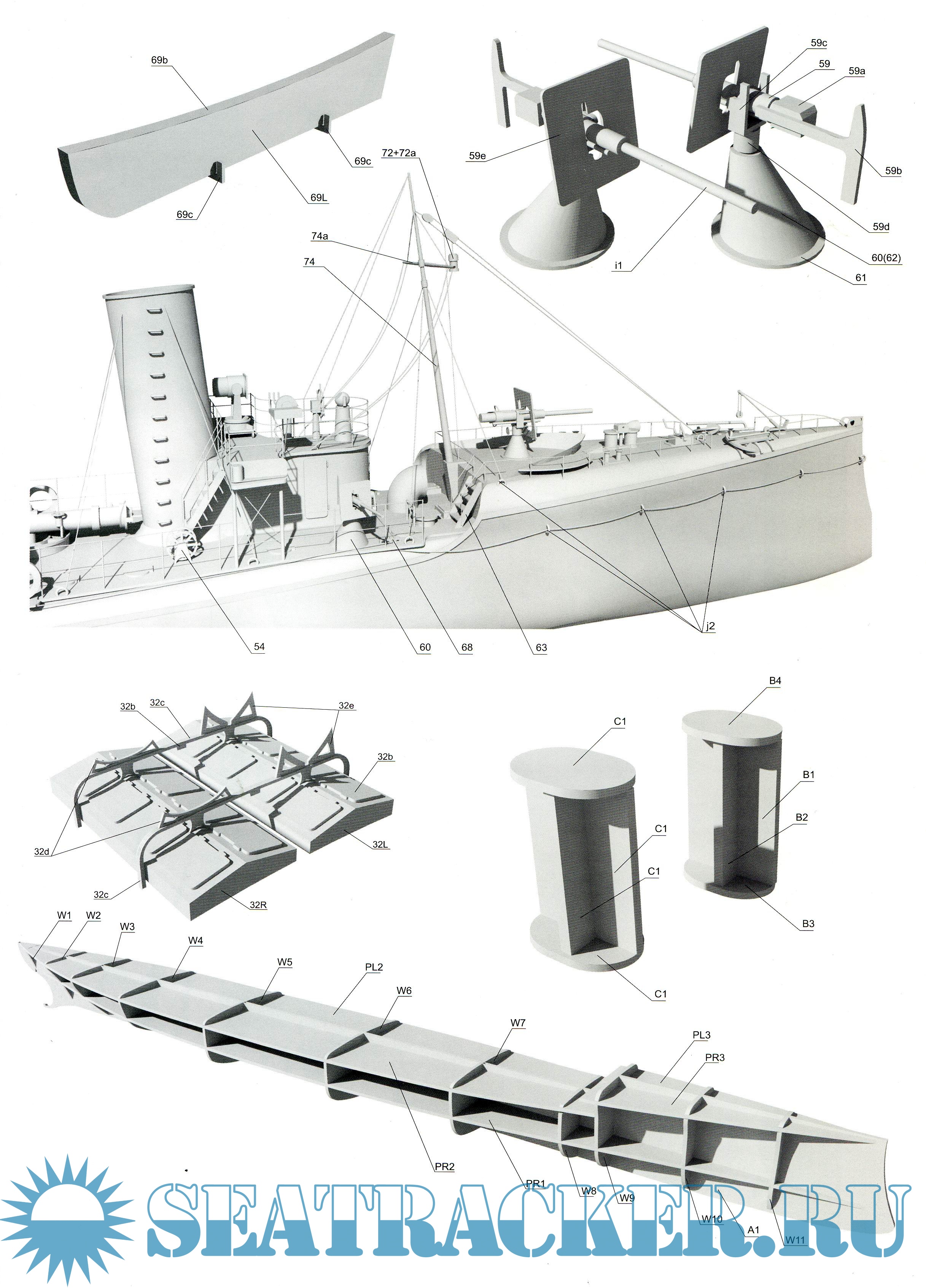 18 листов цветных выкроек и инструкций для создания бумажных моделей Миноносцы Кит и Безшумный в масштабе 1:200