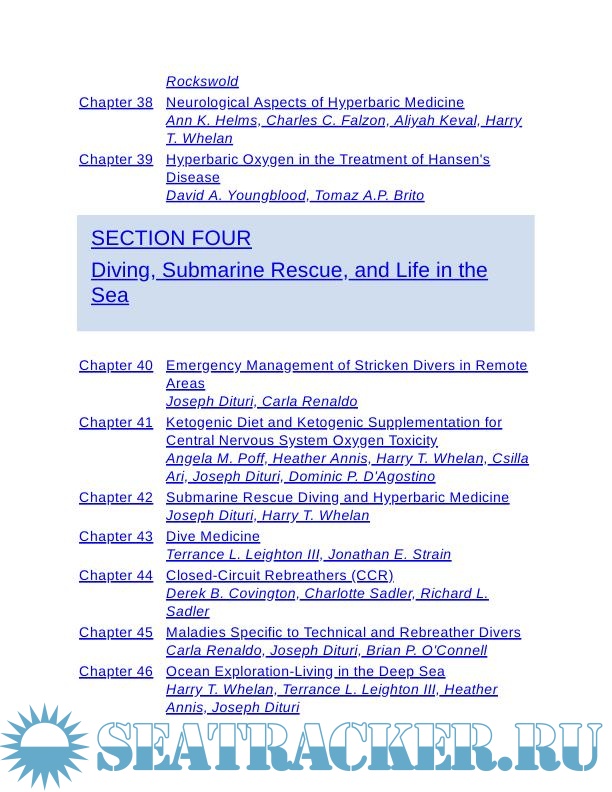 New chapters include indications for hyperbaric oxygen treatment subjects recently approved for treatment such as idiopathic sudden sensorineural hearing loss and central retinal vein occlusion. There are also chapters on submarine rescue and problems that pertain to technical and rebreather diving.