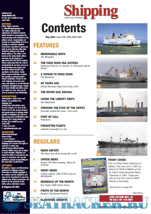 Description: Shipping Today & Yesterday is a specialist magazine for the shipping enthusiast offering up-to-date information, topical and in-depth historical articles.Shipping Today & Yesterday was first produced in March 1990 by, the then Editor and Publisher, John Young. The first edition stated that it would, “offer a news service covering important developments in the Shipping industry Today and will look back at ships and events of Yesterday, with regular features on merchant ships