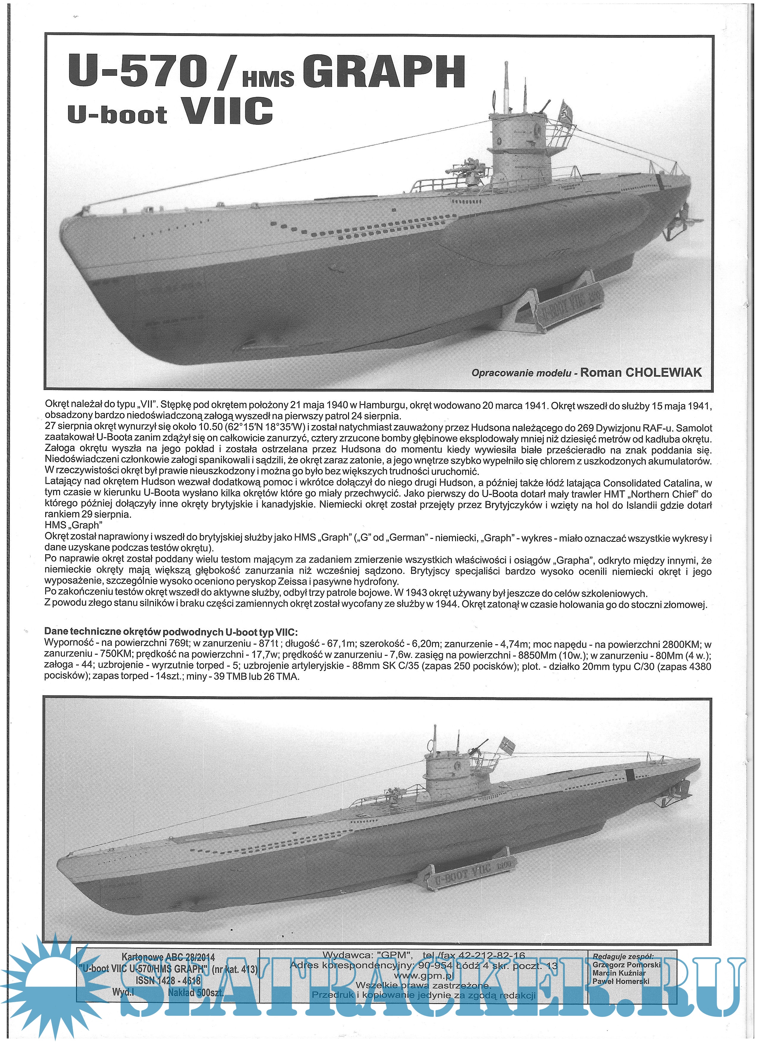 Описание: 16 листов цветных выкроек и инструкций для изготовления бумажной модели германской подводной лодки U-570 в масштабе 1:100