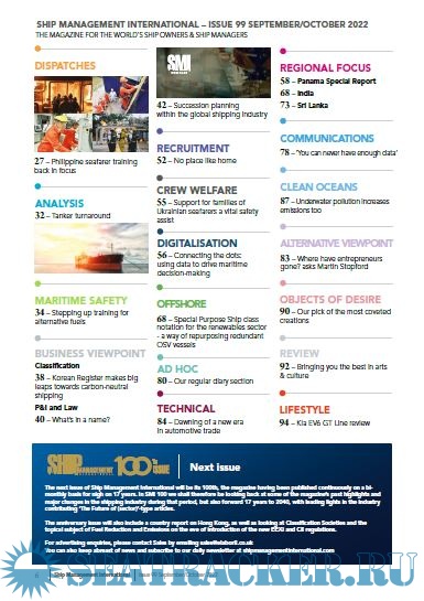 Year: 2022 Language: english Author: SMI Genre: Periodical (magazine) Edition: Issue No. 99 Format: PDF Quality: eBook Pages count: 100 Description: Ship Management International is published bi-monthly and read by the world’s ship owners, operators and ship managers at chief executive and managing director level. It is the only ship owner business magazine in the industry dedicated to covering the entire editorial needs of the owner and the manager at senior executive level and is seen as essential reading for this vibrant and fast-moving industry sector. Hard-hitting articles plus in-depth research and analysis aim to educate and update today’s ship owners and managers on the issues affecting the way they manage their fleets. Regular coverage includes policy and regulation, profit and loss analysis, manning, technical and commercial developments as well as financial analysis together with business management and trade route assessment. The finest maritime writers and industry experts ensure that Ship Management International fulfills its pledge to be the most dynamic and essential shipmanagement magazine in the world.