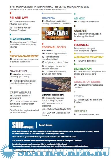 Year: 2023 Language: english Author: SMI Genre: Periodical (magazine) Edition: Issue No. 102 Format: PDF Quality: eBook Pages count: 100 Description: Ship Management International is published bi-monthly and read by the world’s ship owners, operators and ship managers at chief executive and managing director level. It is the only ship owner business magazine in the industry dedicated to covering the entire editorial needs of the owner and the manager at senior executive level and is seen as essential reading for this vibrant and fast-moving industry sector. Hard-hitting articles plus in-depth research and analysis aim to educate and update today’s ship owners and managers on the issues affecting the way they manage their fleets. Regular coverage includes policy and regulation, profit and loss analysis, manning, technical and commercial developments as well as financial analysis together with business management and trade route assessment. The finest maritime writers and industry experts ensure that Ship Management International fulfills its pledge to be the most dynamic and essential shipmanagement magazine in the world.