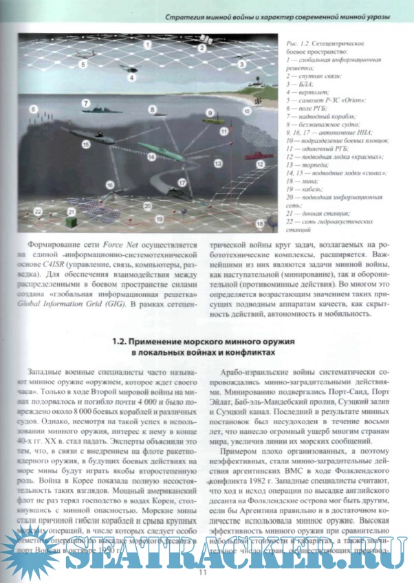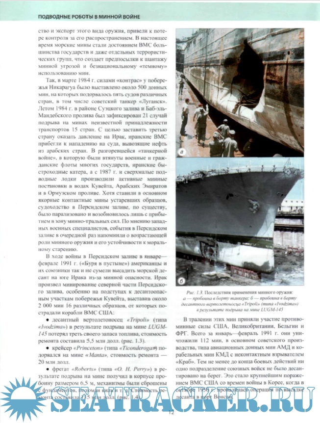 Год выпуска: 2008 Язык: русский Автор: Илларионов Г.Ю., Сиденко К.С., Сидоренков В.В. Жанр: Техническая литература Издательство: Янтарный сказ Формат: PDF Качество: Отсканированные страницы Количество страниц: 119 Описание: В монографии, написанной по материалам открытой зарубежной научно-технической информации, представлены обобщенные сведения по противоминным необитаемым подводным аппаратам (роботам), привелены данные по их конструкции, оснащению и тактнке применения при ведении противоминных действий. Отдельно приведены образцы противоминных необитаемых подводных аппаратов, используемых с надводных кораблей и подводных лодок. В книге содержатся справочные данные об образцах мин, систематизированные по государствам-производителям, годам выпуска и принципам действия аппаратуры, а также математический аппарат по оценке эффективности минных заграждений. Монография предназначена для широкого круга читателей и для специалистов в области морских технологий. Представленные материалы могут быть использованы в военно-морских учебных заведениях и на военных кафедрах вузов страны.