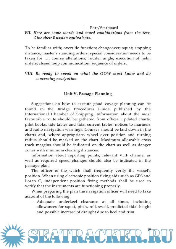 The purpose of the manual is the further development of oral speech skills, the expansion and systematization of vocabulary. The five sections of the manual cover the topics necessary for the work of an officer on duty. The text material is taken from international conventions, manuals published by the United Kingdom Maritime Institute for boatmasters, as well as from the instructions of shipping companies. Designed for senior cadets of the specialty 180402.65 "Navigation". Also, the manual can be used in the preparation of shift assistants for certification in English.