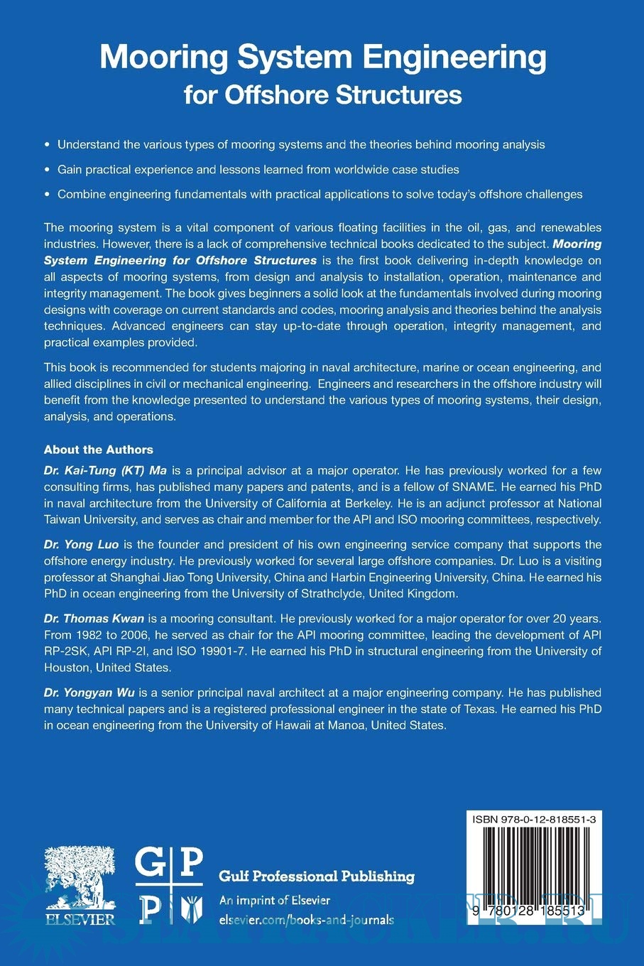 Year: 2019 Language: english Author: Kai-Tung Ma Publisher: Gulf Professional Publishing Edition: 1st ISBN: 978-0128185513 Format: PDF Quality: eBook Pages count: 329 Description: The mooring system is a vital component of various floating facilities in the oil, gas, and renewables industries. However, there is a lack of comprehensive technical books dedicated to the subject. Mooring System Engineering for Offshore Structuresis the first book delivering in-depth knowledge on all aspects of mooring systems, from design and analysis to installation, operation, maintenance and integrity management. The book gives beginners a solid look at the fundamentals involved during mooring designs with coverage on current standards and codes, mooring analysis and theories behind the analysis techniques. Advanced engineers can stay up-to-date through operation, integrity management, and practical examples provided. This book is recommended for students majoring in naval architecture, marine or ocean engineering, and allied disciplines in civil or mechanical engineering. Engineers and researchers in the offshore industry will benefit from the knowledge presented to understand the various types of mooring systems, their design, analysis, and operations. About the Author Dr. Kai-Tung (KT) Ma is a principal advisor at a major operator. He has previously worked for a few consulting firms, has published many papers and patents, and is a fellow of SNAME. He earned his PhD in naval architecture from the University of California at Berkeley. He is an adjunct professor at National Taiwan University, and serves as chair and member for the API and ISO mooring committees, respectively.