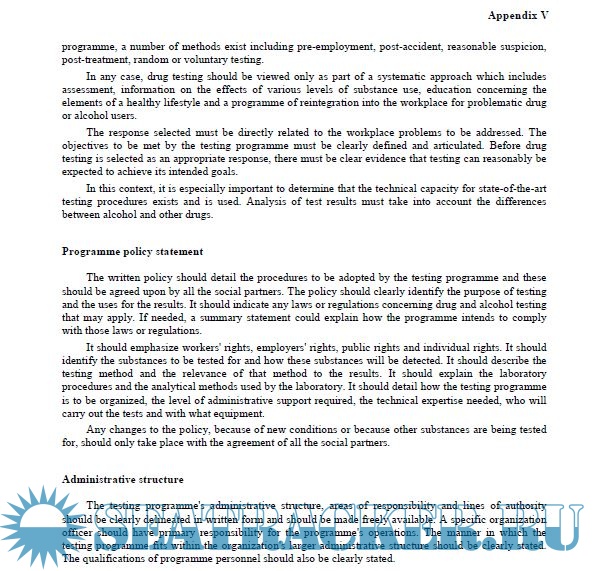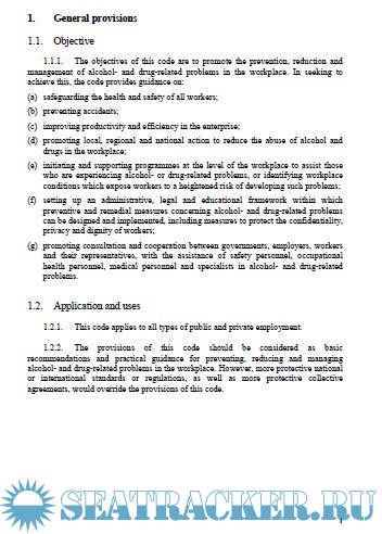 The practical recommendations of this code of practice are intended to provide guidance to all those who have responsibility for addressing alcohol- and drug-related problems at the workplace. The code is not intended to replace international standards, national laws, regulations or other accepted standards. Alcohol and drug policies and programmes should apply to all staff, managers and employees and should not discriminate on grounds of race, colour, sex, religion, political opinion, national extraction or social origin.