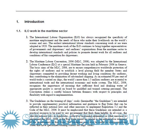 Description: The Guidelines on the training of ships’ cooks (hereinafter “the Guidelines”) are intended to provide supplementary practical information and guidance to flag States that can be reflected in their national laws and other measures to implement Regulation 3.2 and the Code of the MLC, 2006. It must be emphasized that these Guidelines are intended as a practical resource to be used by any government that finds them helpful. In all cases, the relevant national laws or regulations, collective bargaining agreements or other measures to implement the MLC, 2006, in the flag State should be viewed as the authoritative statement of the requirements in that State. The Guidelines may also be useful to labour-supplying States that have specialized training schools for ships’ cooks.