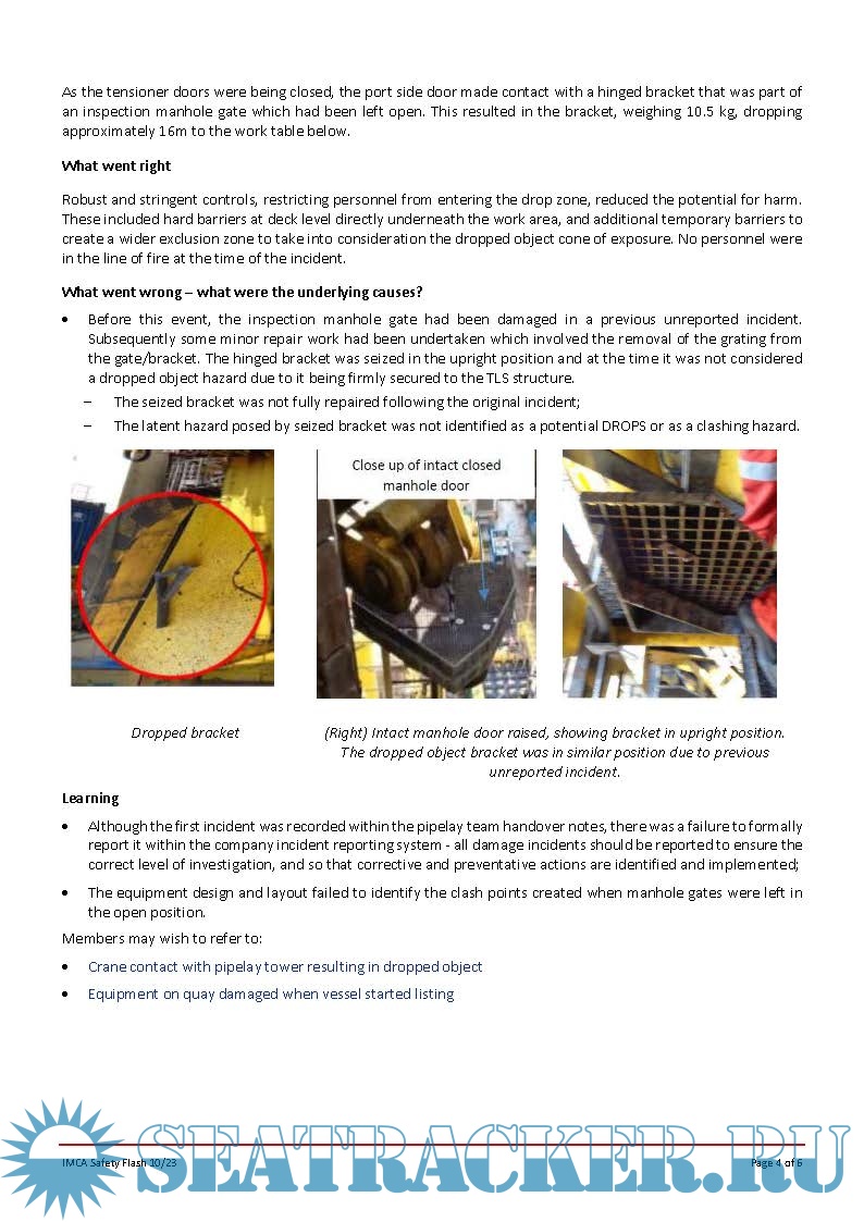 Description: The International Marine Contractors Association ( IMCA ) Safety Flashes disseminate important information on incidents and potential hazards and the lessons learnt from them that can help prevent incidents occurring elsewhere in the industry.IMCA Safety Flashes and systems for incident reporting and analysis are an important tool for sharing vital information.By publishing them, IMCA helps its members around the world identify potential hazards, share lessons learned and avoid repetition.Safety Flashes should be succinct, specific, factually correct and written in clear language.The Secretariat will assist with this through formatting and checking of the material submitted.