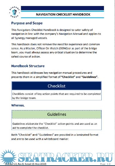 This Navigators Checklist Handbook is designed to cater safety of navigation in line with the company's Navigation Manual and applies to all Synergy managed vessels.