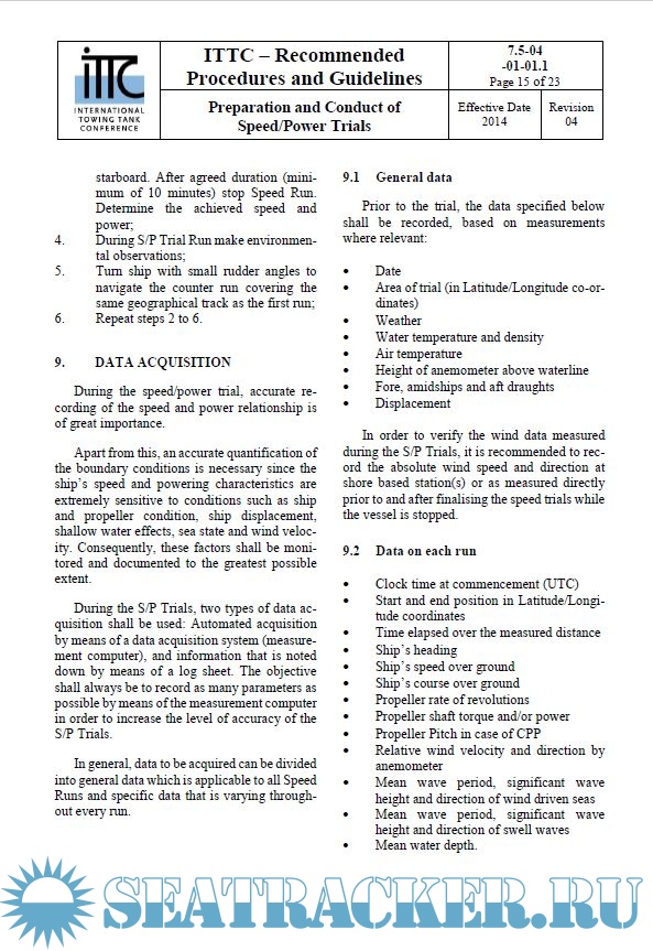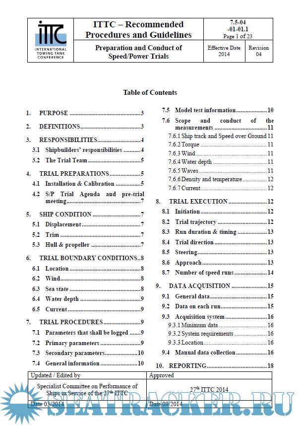 Description: The primary purpose of speed-power trials is to determine ship performance in terms of speed, power and propeller revolutions under pre-scribed ship conditions, and thereby verifying the satisfactory attainment of the contractually stipulated Ship Speed and to provide the Ship Speed for the calculation of the Energy Effi-ciency Design Index (EEDI) as required by IMO.