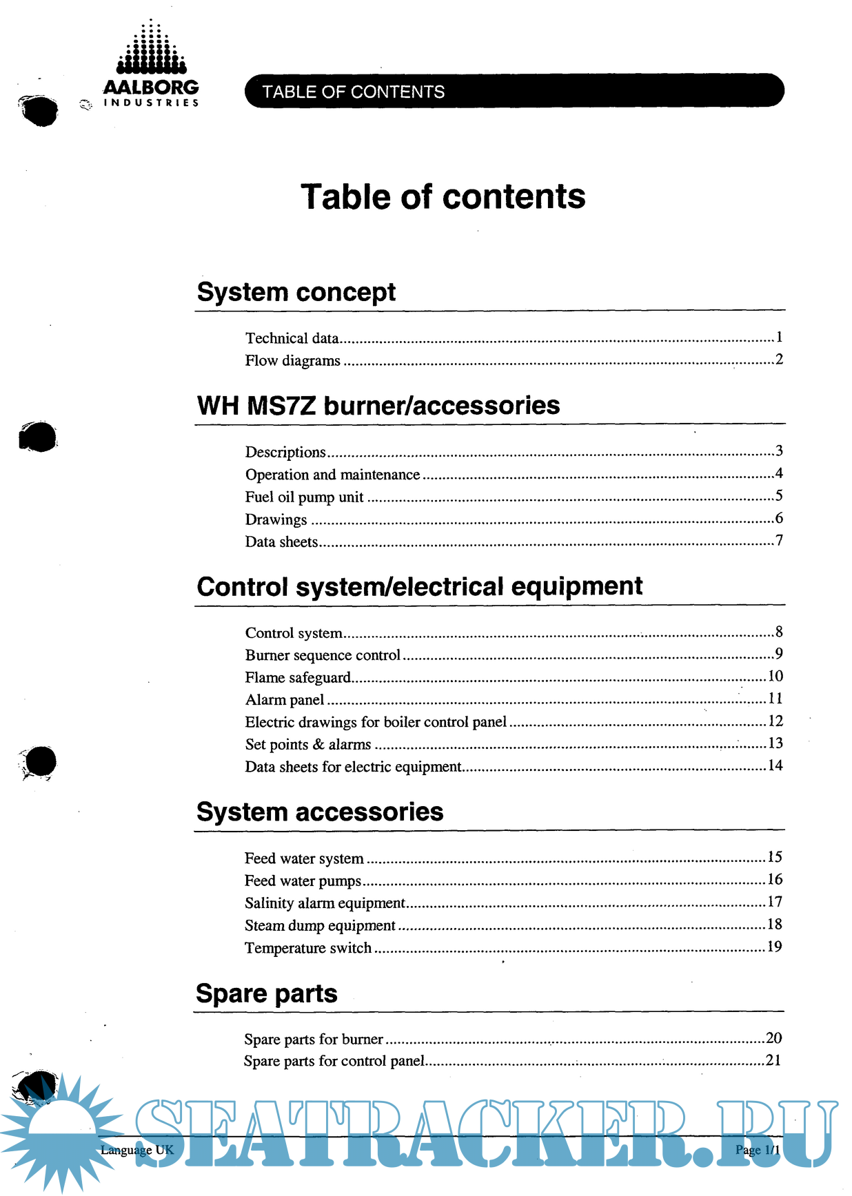 Language: english Genre: Documentations Format: PDF Quality: Scanned pages Number of pages: 384 Description: nstruction manual for boiler plant. Burner type: 1 x WH MS7Z Project No.: 735488 Table of contents System concept Technical data..............................................................................................................1 Flow diagrams.............................................................................................................2 WH MS7Z burner/accessories Descriptions.................................................................................................................3 Operation and maintenance.........................................................................................4 Fuel oil pump unit.......................................................................................................5 Drawings.....................................................................................................................6 Data sheets...................................................................................................................7 Control system/electrical equipment Control system.............................................................................................................8 Burner sequence control..............................................................................................9 Flame safeguard.........................................................................................................10 Alarm panel...............................................................................................................11 Electric drawings for boiler control panel.................................................................12 Set points & alarms...................................................................................................13 Data sheets for electric equipment.............................................................................14 System accessories Feed water system.....................................................................................................15 Feed water pumps......................................................................................................16 Salinity alarm equipment...........................................................................................17 Steam dump equipment.............................................................................................18 Temperature switch...................................................................................................19 Spare parts Spare parts for burner................................................................................................20 Spare parts for control panel......................................................................................21