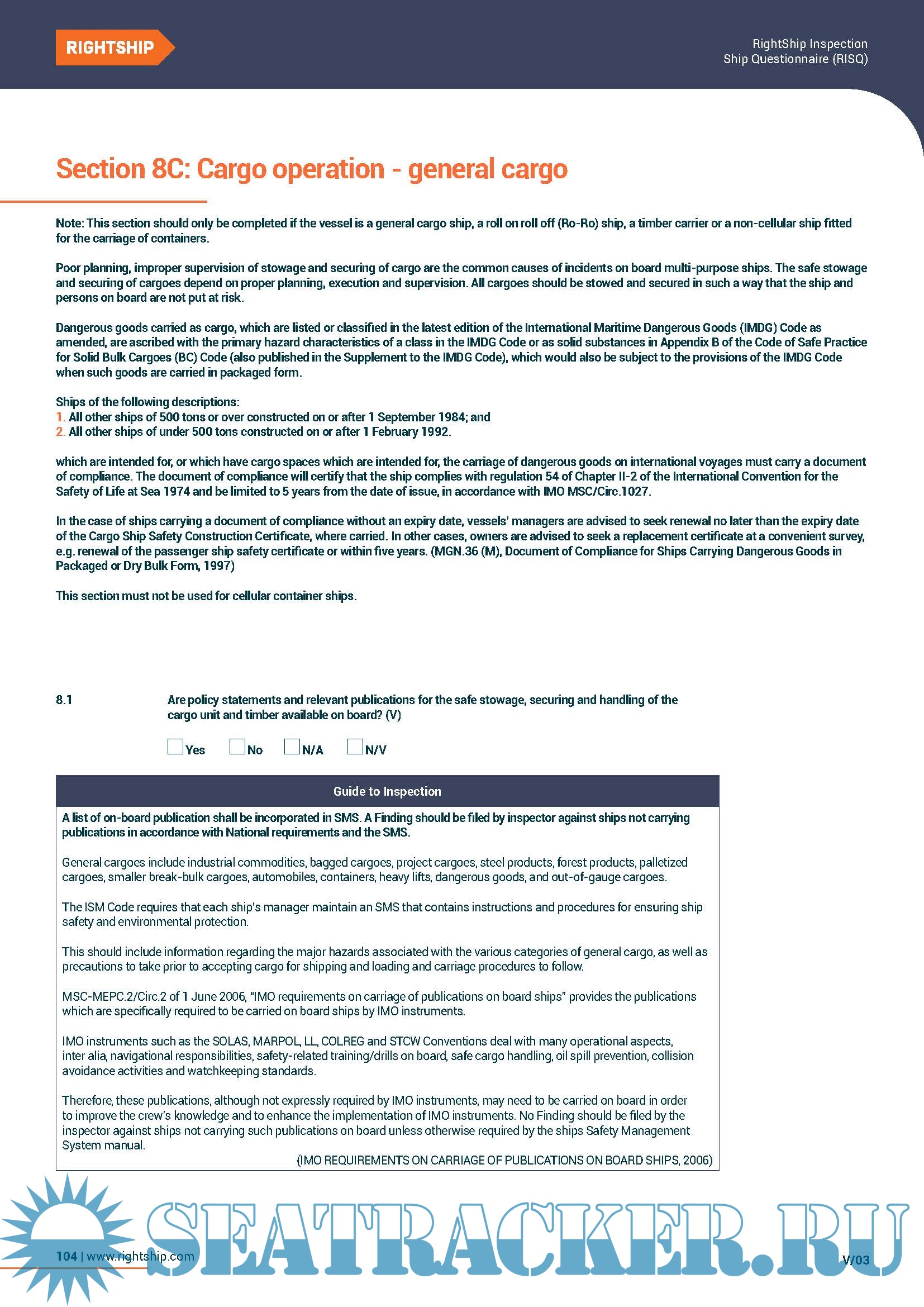 A guide to inspection is provided for many of the questions in the questionnaire, which will assist shipowners and managers in understanding industry expectations. It will also aid the inspector when answering the questions and completing the inspection report.