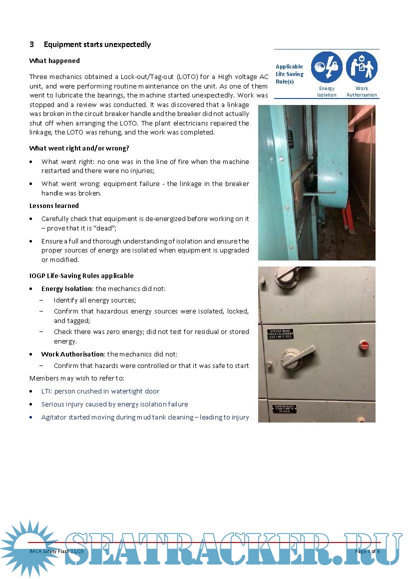Description: The International Marine Contractors Association ( IMCA ) Safety Flashes disseminate important information on incidents and potential hazards and the lessons learnt from them that can help prevent incidents occurring elsewhere in the industry.IMCA Safety Flashes and systems for incident reporting and analysis are an important tool for sharing vital information.By publishing them, IMCA helps its members around the world identify potential hazards, share lessons learned and avoid repetition.Safety Flashes should be succinct, specific, factually correct and written in clear language.The Secretariat will assist with this through formatting and checking of the material submitted.