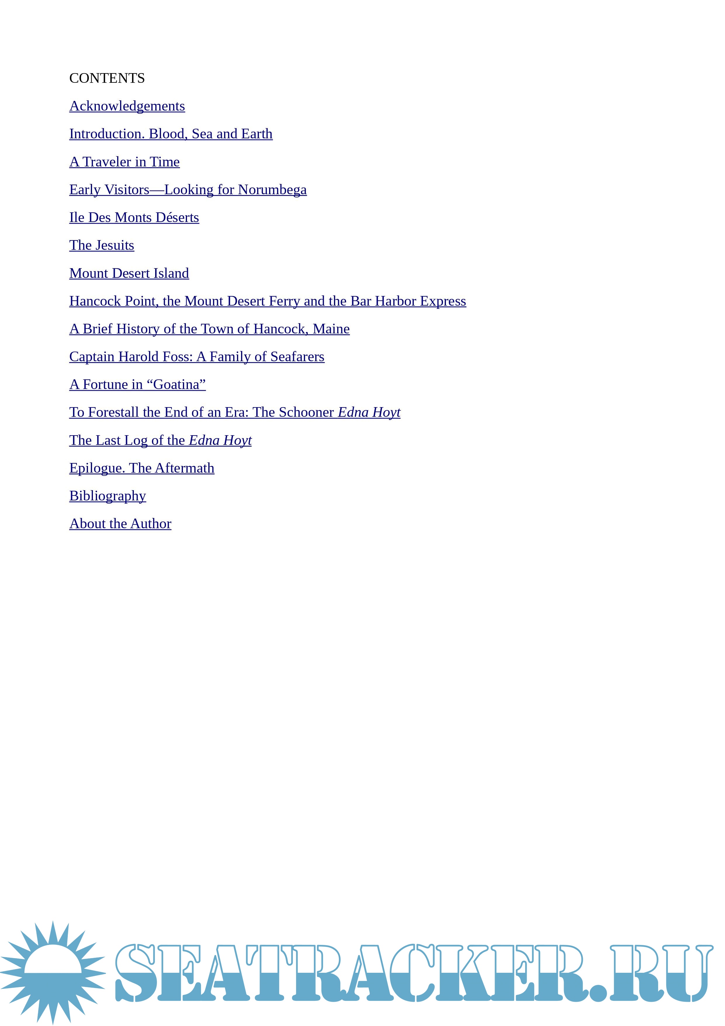CONTENTS Acknowledgements Introduction. Blood, Sea and Earth A Traveler in Time Early Visitors—Looking for Norumbega Ile Des Monts Déserts The Jesuits Mount Desert Island Hancock Point, the Mount Desert Ferry and the Bar Harbor Express A Brief History of the Town of Hancock, Maine Captain Harold Foss: A Family of Seafarers A Fortune in “Goatina” To Forestall the End of an Era: The Schooner Edna Hoyt The Last Log of the Edna Hoyt Epilogue. The Aftermath Bibliography About the Author