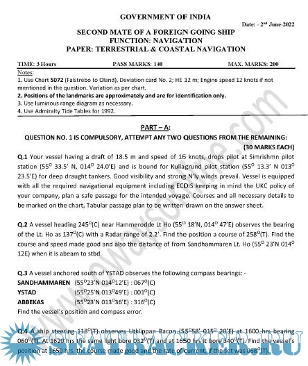 Question Paper Set (March 2023) for Second Mate (F.G.) Mercantile Marine Department (MMD), India…