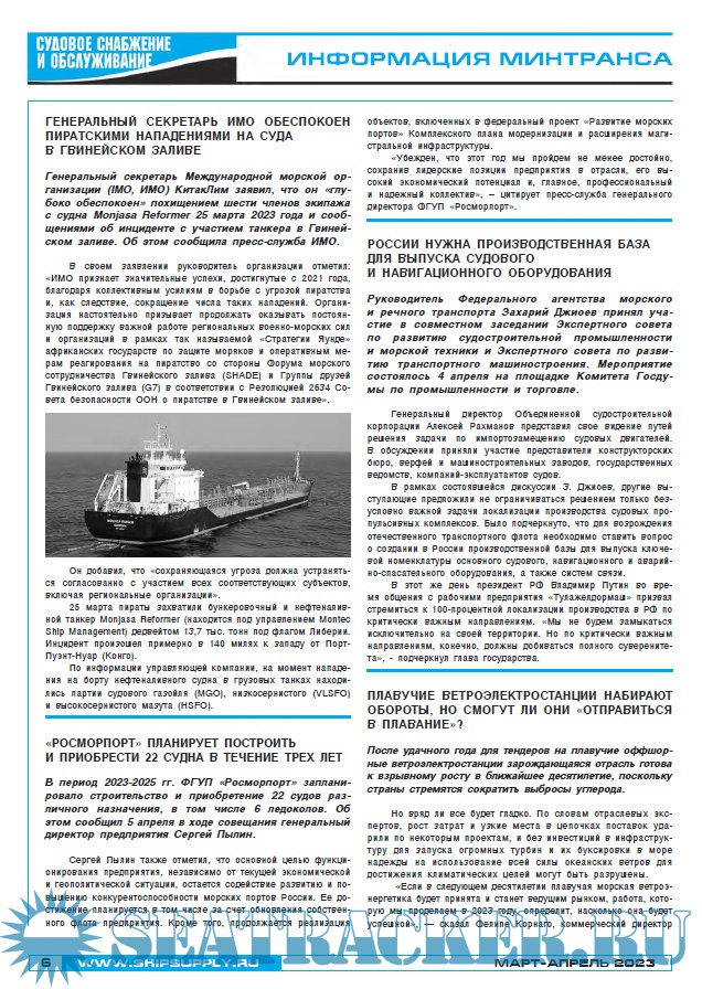 Описание: "Судовое снабжение и обслуживание" периодический информационный бюллетень, издается с 1999 года и в настоящее время по праву занимает одно из ведущих мест среди специализированных отраслевых печатных изданий.