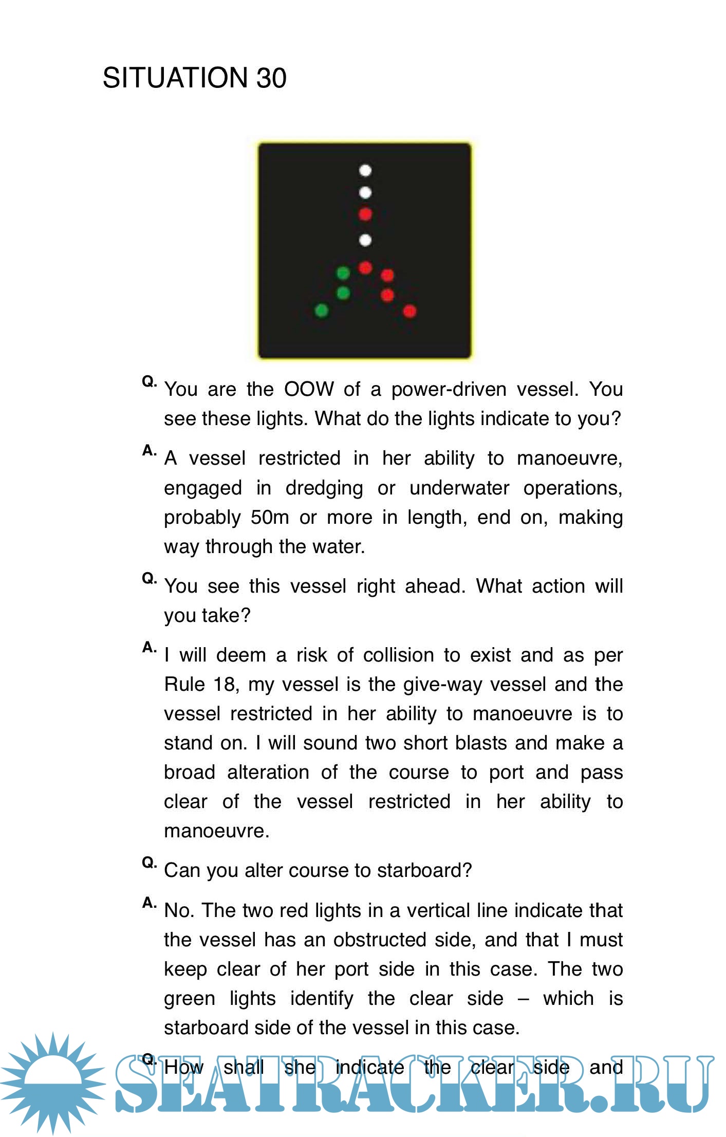 A self-teaching aid that covers International regulations for preventing collision at sea 1972 (Colregs) or Rules of the Road, including navigation lights and related situations that could be asked within the Maritime and Coastguard Agency oral examinations for the deck certificate of competency.
