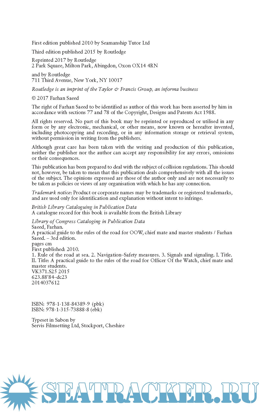 Year: 2017 Language: english Author: Farhan Saeed Genre: Guide Publisher: Routledge Edition: 3rd | Reprinted 2017 ISBN: 9781315738888 Format: PDF Quality: Scanned pages Pages count: 211 Description: For OOW, Chief Mate and Master Students A self-teaching aid that covers International regulations for preventing collision at sea 1972 (Colregs) or Rules of the Road, including navigation lights and related situations that could be asked within the Maritime and Coastguard Agency oral examinations for the deck certificate of competency. This book is divided into two sections. The first section contains simple explanations of the Rules of the Road, while the second section covers more than sixty situations, exam questions and model answers. Interactive navigation light identification software is also available on a companion website to offer further testing before examination. All questions are asked randomly, and will help prepare you for the oral exam. ● Self-teaching guide to the International regulations for preventing collision at sea 1972 (Colregs) / Maritime Coastguard Agency (MCA) Rules of the Road oral examinations ● Scenarios, questions and model answers help you prepare for the examination ● Interactive navigation light identification software on a companion website allows students to test themselves before entering exams. Visit the website at www.seamanshiptutor.com