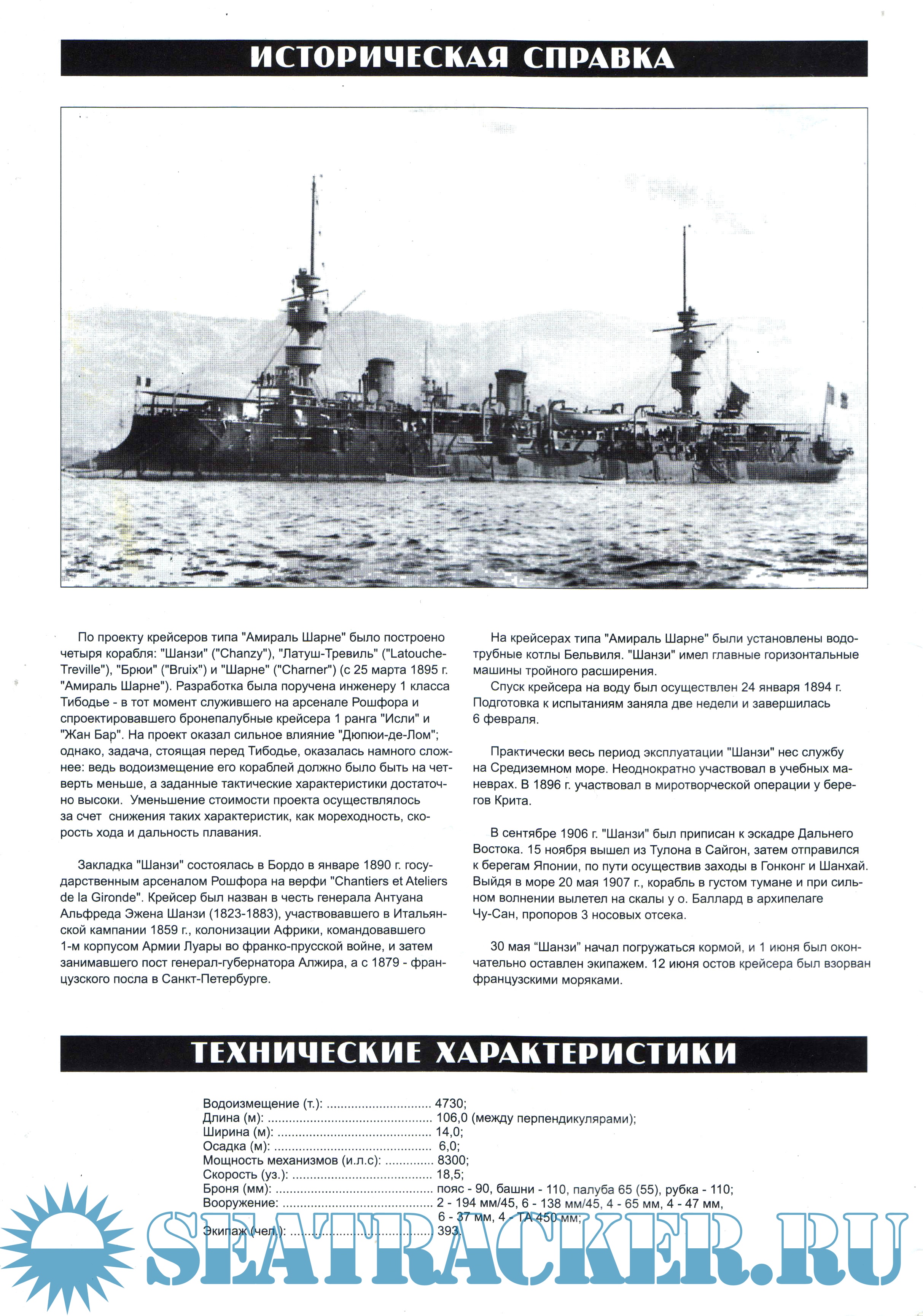 Описание: 38 листов цветных выкроек и инструкций для создания бумажной модели броненосного крейсера I ранга ''Chanzy'' Франция 1894 год в масштабе 1:200