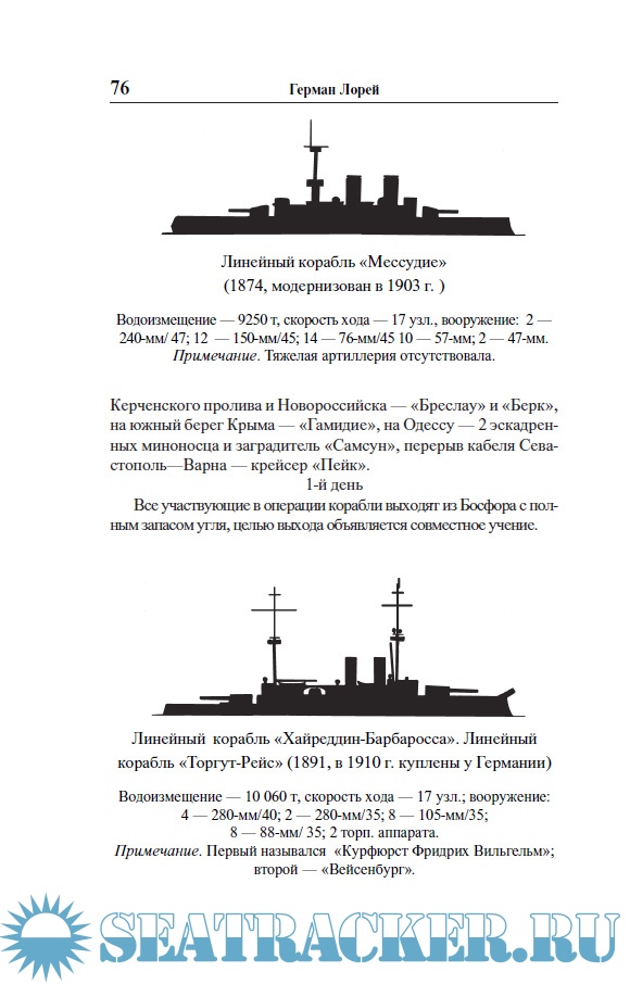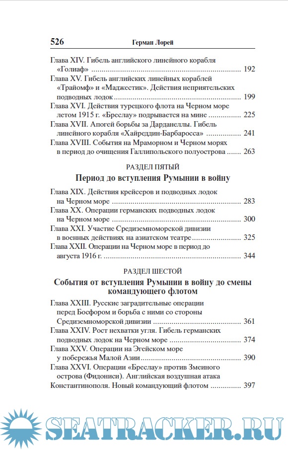 Подробнейшим образом освещаются деятельность и судьба крейсеров "Гебен" и "Бреслау", о чем до публикации Лорея в 1937 г. даже в Германии не было полных сведений.