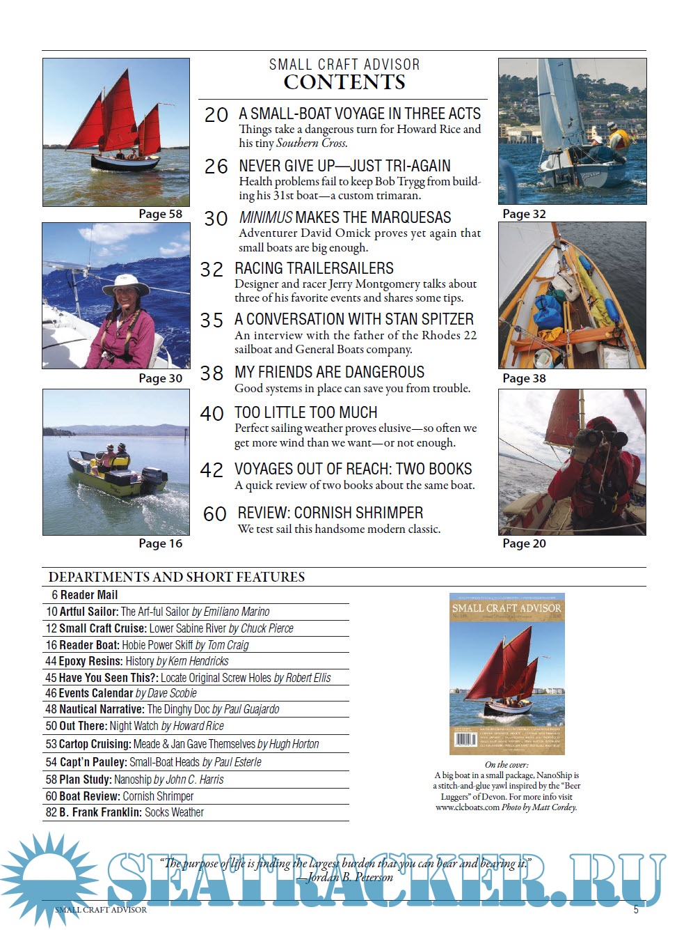 Description: Small boats, big adventure! The only magazine focused on small and trailerable sailboats, cruising, and adventure. Each issue features places to sail, how-to and modification articles, a plan study for the boat builder, and a feature-length review of a production sailboat.