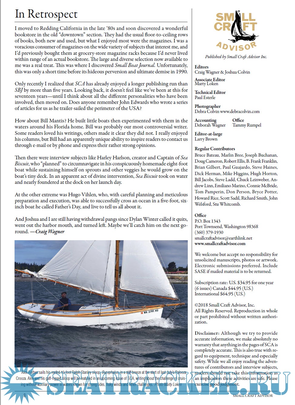 Year: 2018 Language: English Author: Craig Wagner & Joshua Colvin Genre: Reference book Edition: (#109) January/February 2018 Format: PDF Quality: eBook Pages count: 84 Description: Small boats, big adventure! The only magazine focused on small and trailerable sailboats, cruising, and adventure. Each issue features places to sail, how-to and modification articles, a plan study for the boat builder, and a feature-length review of a production sailboat.