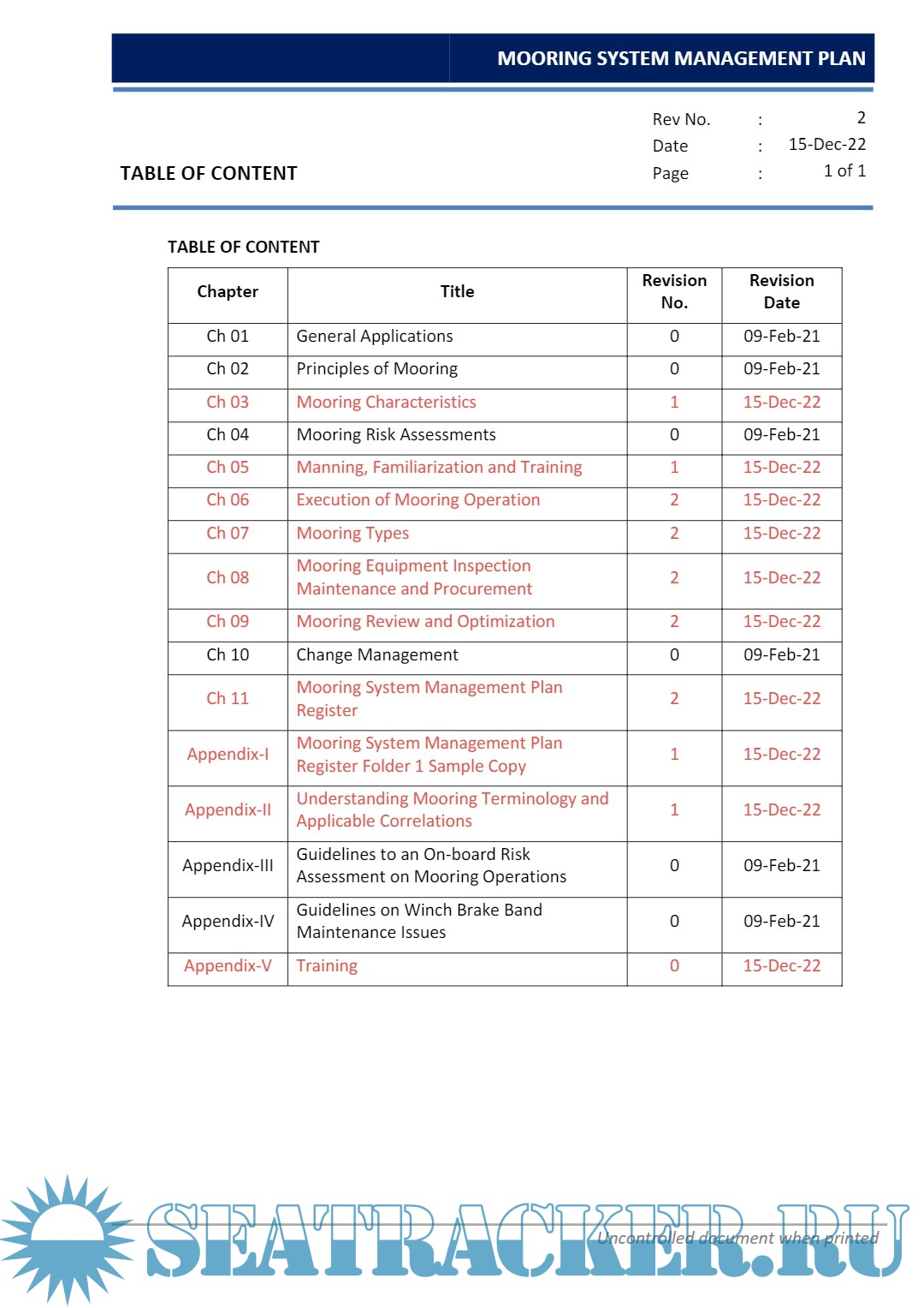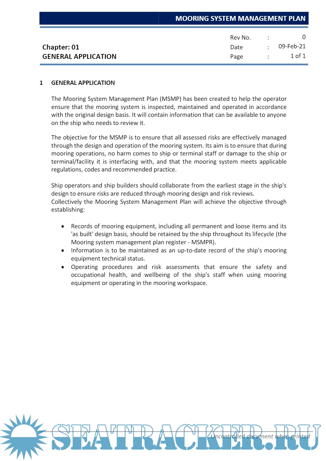 Description: The Mooring System Management Plan (MSMP) has been created to help operator ensure the mooring system is inspected, maintained and operated in accordance with the original design basis. It will contain information that can be available to anyone on the ship who needs to review it.The objective for the MSMP is to ensure that all assessed risks are effectively managed through the design and operation of the mooring system. Its aim is toensure that during mooring operations, no harm comes to ship or terminal staff or damage to the ship or terminal/facility it is interfacing with and that the mooring system meets applicable regulations, codes and recommended practice.