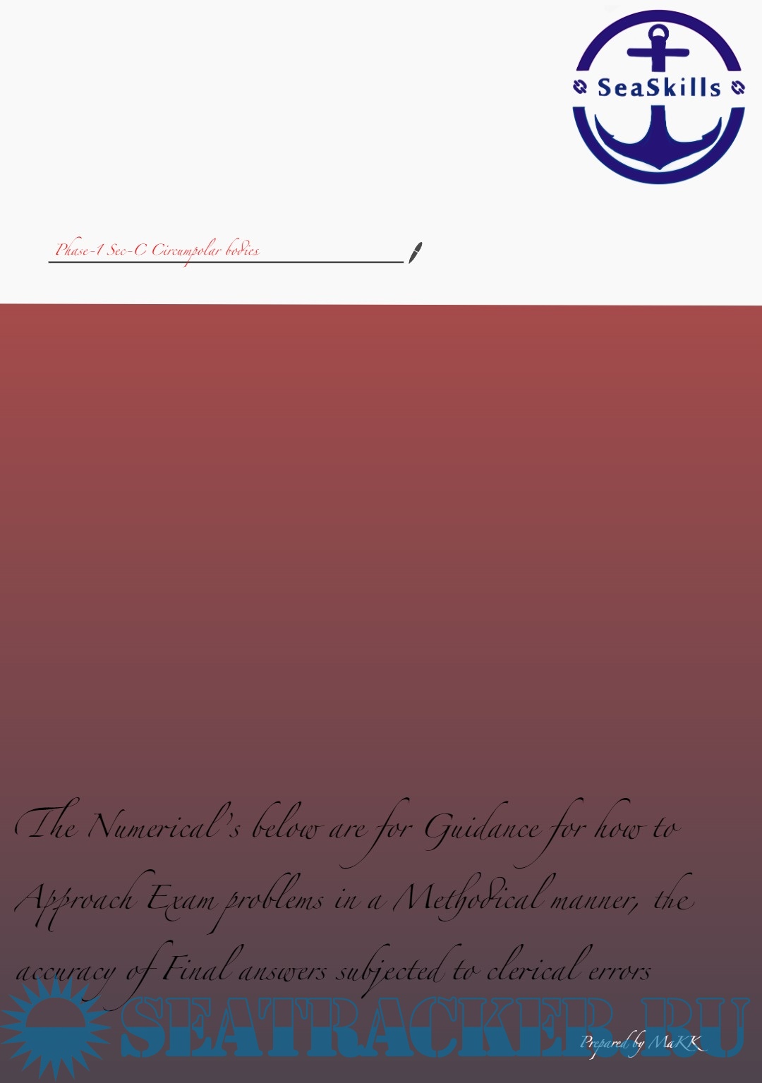 Year: 20xx Language: english Author: Makk Publisher: Seaskills Maritime Academy , Coimbatore, India Format: PDF Quality: eBook Pages count: 7 Description: Paper: Terrestrial and Coastal Navigation. Section-C: Circumpolar bodies solved from Past Question Papers of Mercantile Marine Department (MMD), India Examinations for Phase I (Chief Mate F.G.)