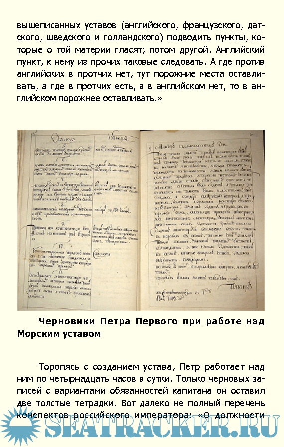 Описание: Наверное, ни один из законов России но имеет столь славной истории, как Морской устав Петра Великого. Принятый в 1720 году, он просуществовал до эпохи парового флота, да и в последующее время многие его главы так и остались неизменными.